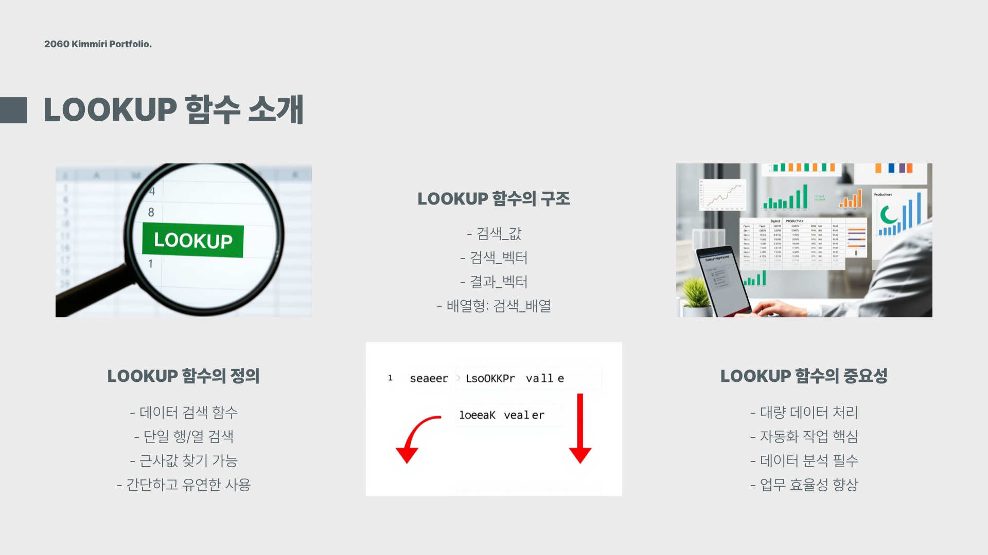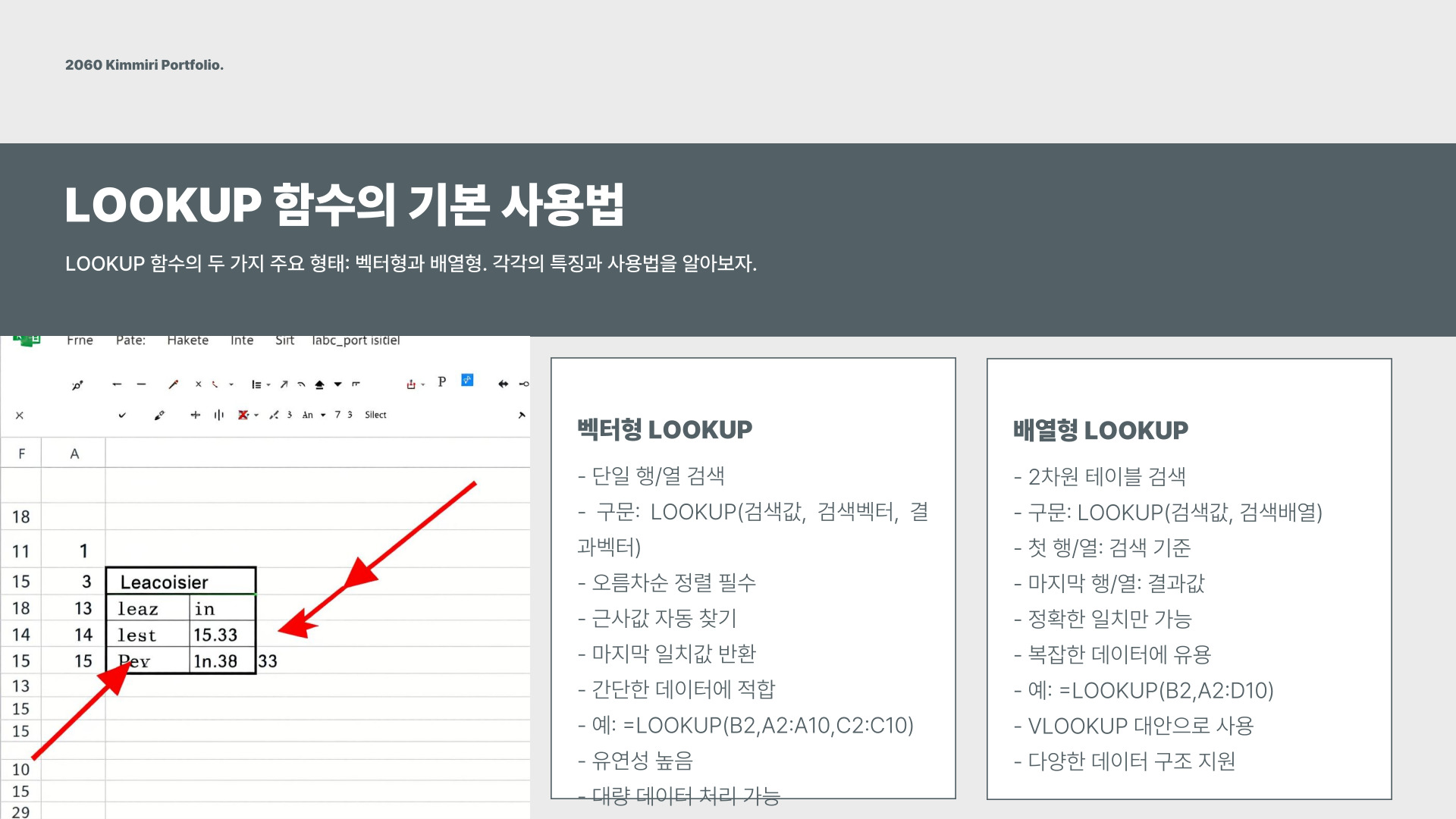 lookup 함수는 주어진 범위에서 특정 값의 위치를 찾고, 해당 위치에 있는 값을 반환하는 함수입니다. 기본적으로 두 가지 형태가 있으며, 벡터형과 배열형이 있습니다. 벡터형은 단일 행 또는 열에서 값을 찾고, 배열형은 여러 행과 열에서 값을 찾습니다. 이러한 구조는 데이터 분석 시 매우 중요한 역할을 합니다.