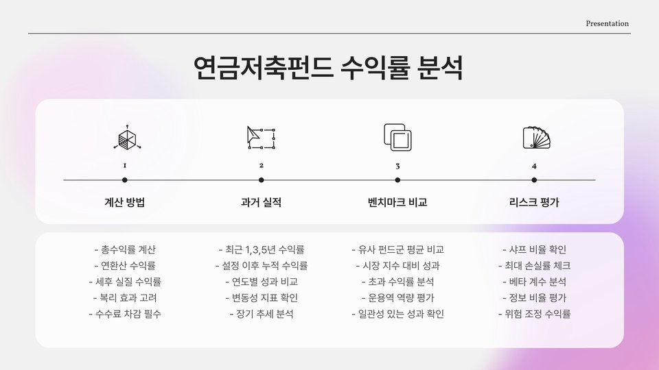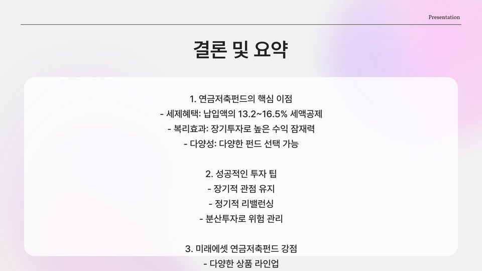결론적으로, 연금저축펀드는 개인의 노후 대비에 중요한 역할을 하는 금융 상품입니다. 미래에셋 연금저축펀드는 특히 안정적이고 다양한 투자 리스크를 분산할 수 있도록 도와줘, 많은 이들에게 추천되는 선택입니다.