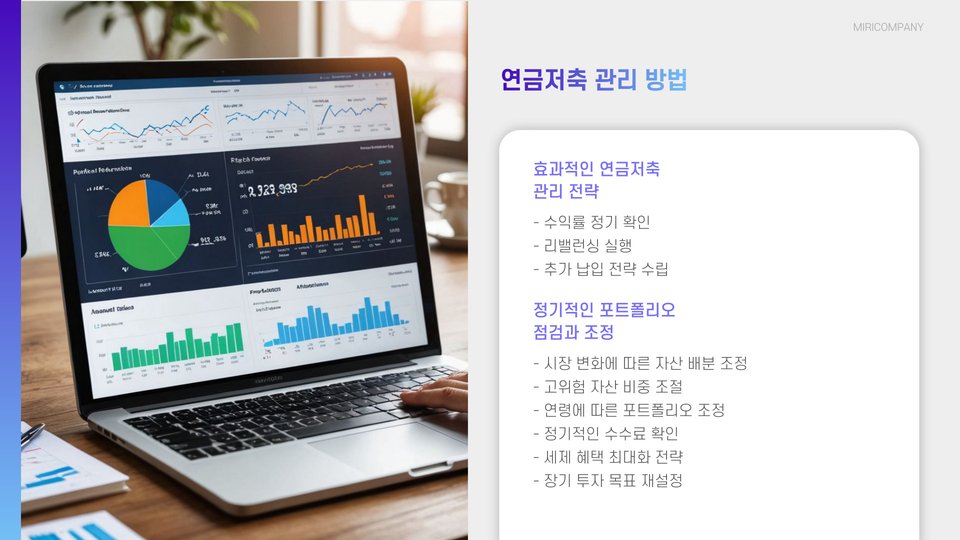 연금저축 상품에 가입한 후에는 주기적인 관리가 필요합니다. 정기적으로 수익률을 확인하고, 필요 시 포트폴리오를 조정하는 것이 좋습니다. 또한, 세액 공제를 최대한 활용하여 세금을 절감하는 방법도 고려해야 합니다. 마지막으로, 연금저축 상품의 해지 조건 및 절차를 미리 숙지해 두는 것이 필요합니다.