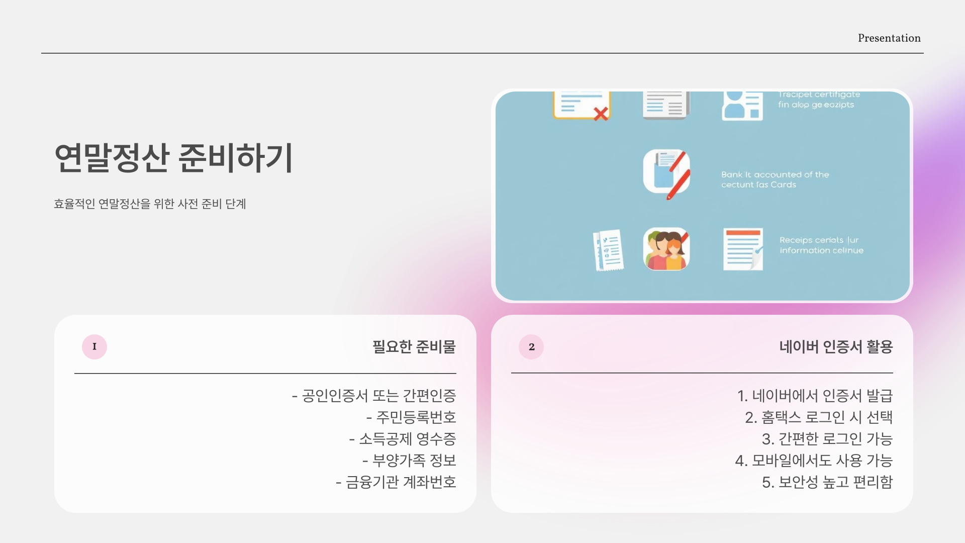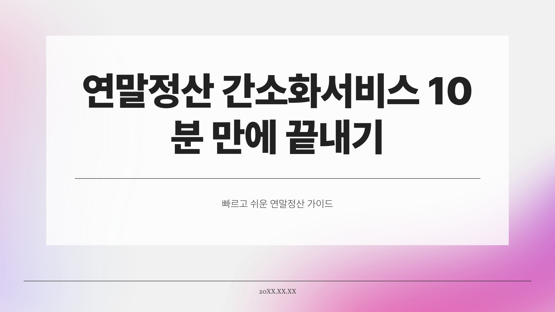 연말정산 간소화서비스를 통해 복잡한 서류 작업을 최소화하고, 보다 효율적으로 연말정산을 마무리할 수 있습니다. 10분 만에 끝낼 수 있는 이 서비스를 적극 활용하여 시간과 노력을 절약해 보세요. 필요한 서류를 미리 준비하고, 공제 항목을 잘 확인하는 것이 성공적인 연말정산의 열쇠입니다.