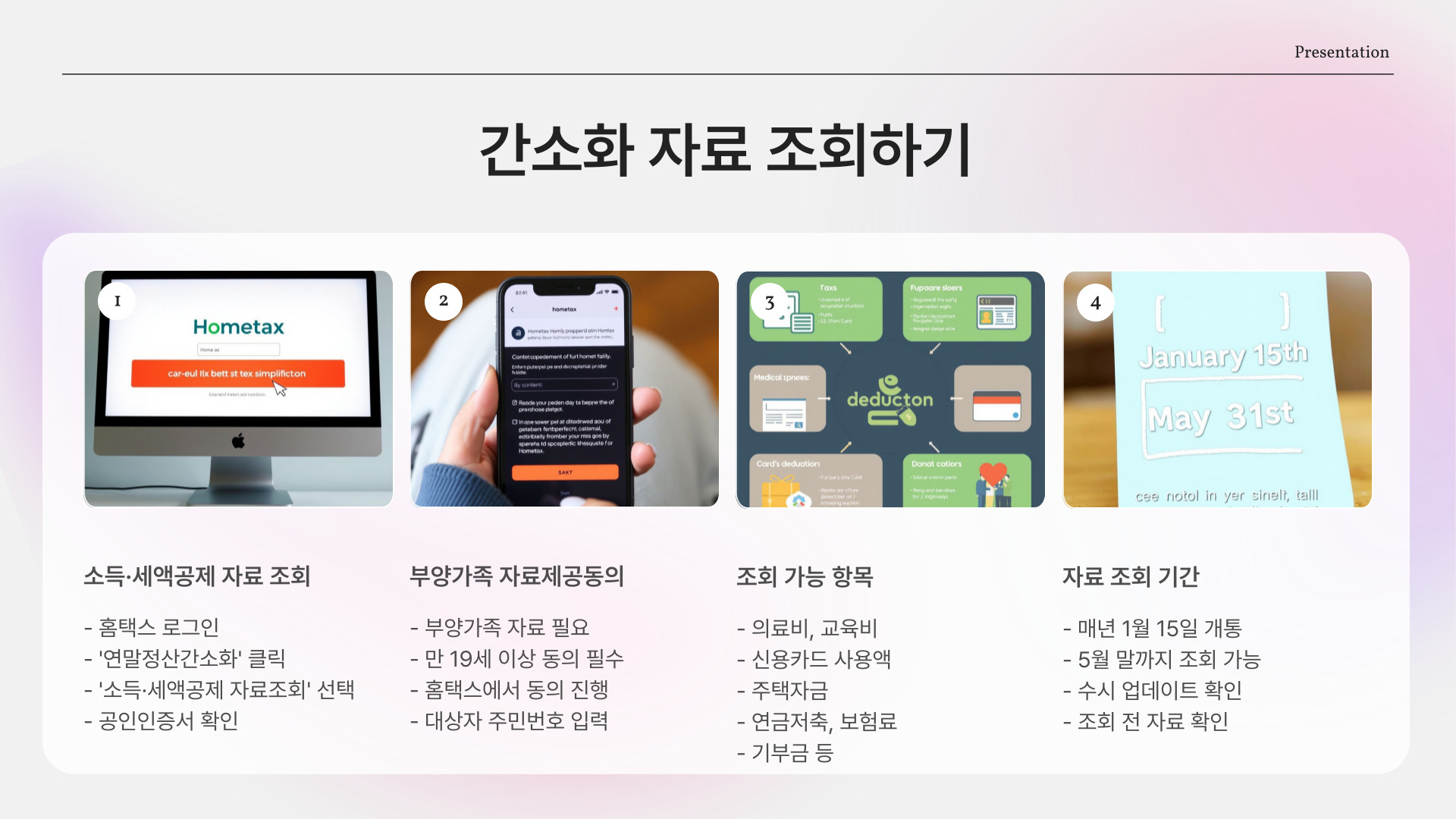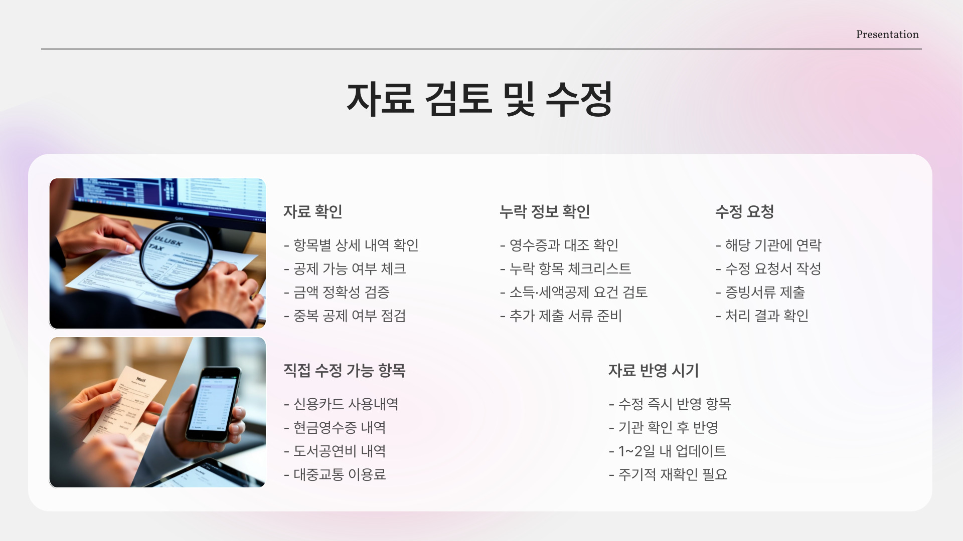 서비스를 통해 제공되는 자료에는 의료비, 교육비, 기부금, 주택자금 등의 항목이 포함됩니다. 이 자료들은 자동으로 정리되어 제공되므로, 사용자는 필요한 항목만 선택하여 제출하면 됩니다. 또한, 국세청에서는 각종 공제 항목에 대한 상세한 설명도 함께 제공하므로, 공제 항목을 놓치는 일이 줄어듭니다.