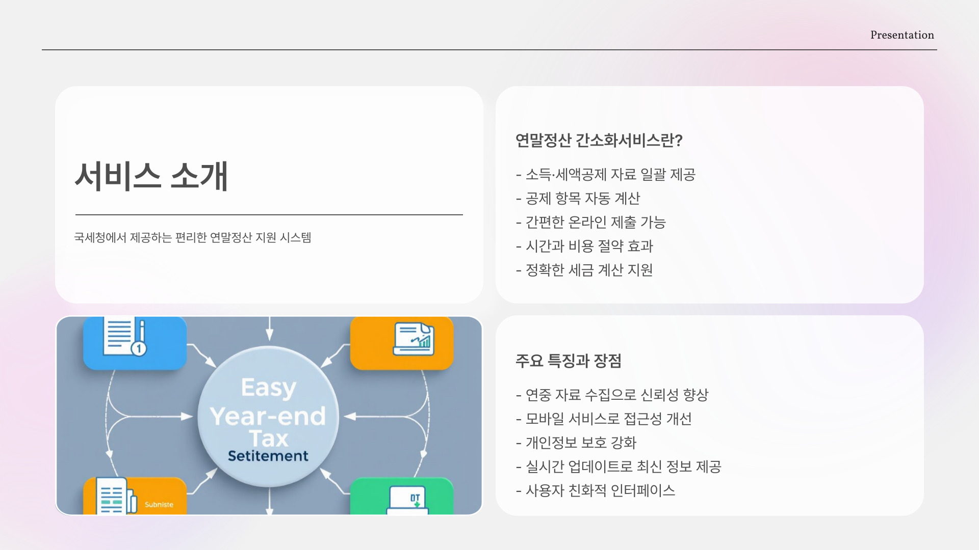 연말정산 간소화서비스는 국세청이 제공하는 온라인 서비스로, 근로자들이 연말정산을 보다 쉽게 진행할 수 있도록 돕는 시스템입니다. 이 서비스는 필요한 서류들을 자동으로 수집하고 정리해 주며, 사용자에게는 필요한 정보만을 제공합니다. 이를 통해 근로자들은 복잡한 서류 작업을 줄이고, 보다 신속하게 연말정산을 완료할 수 있게 됩니다.