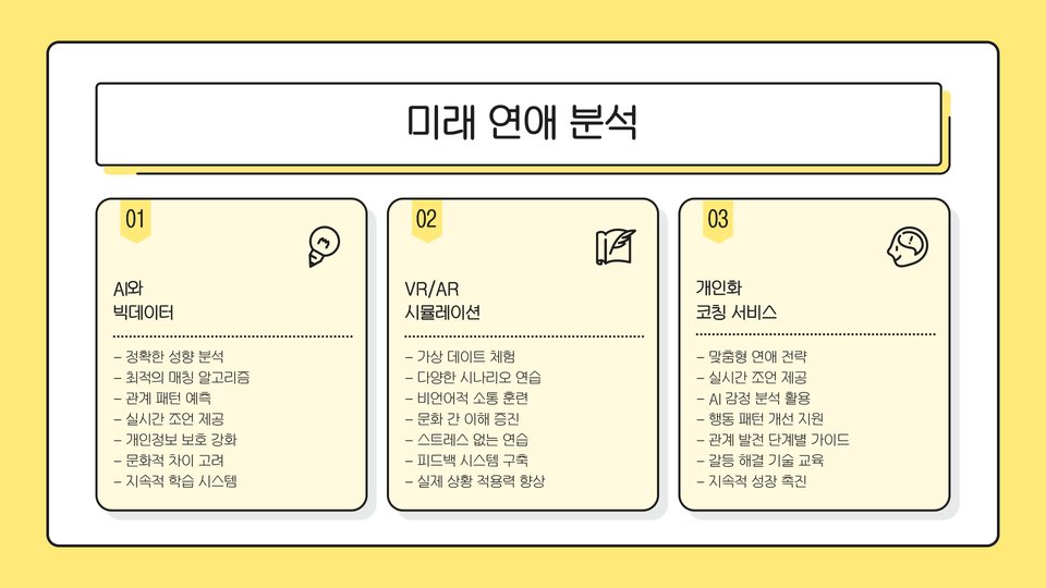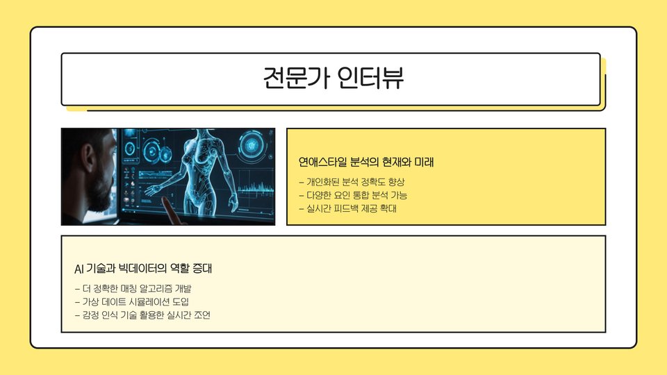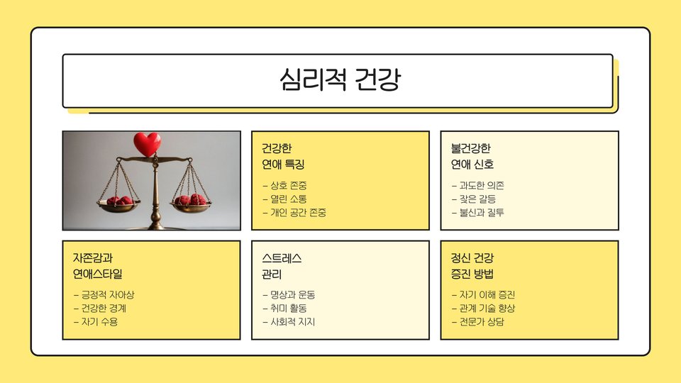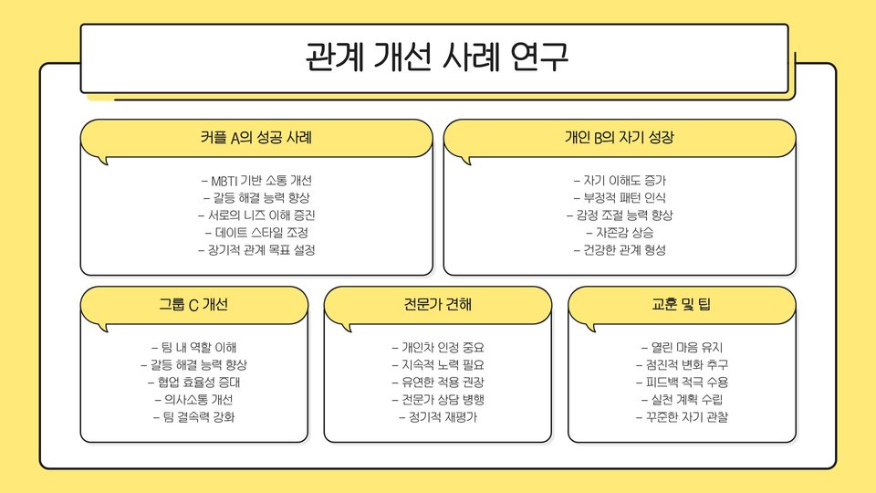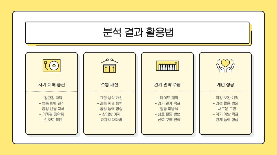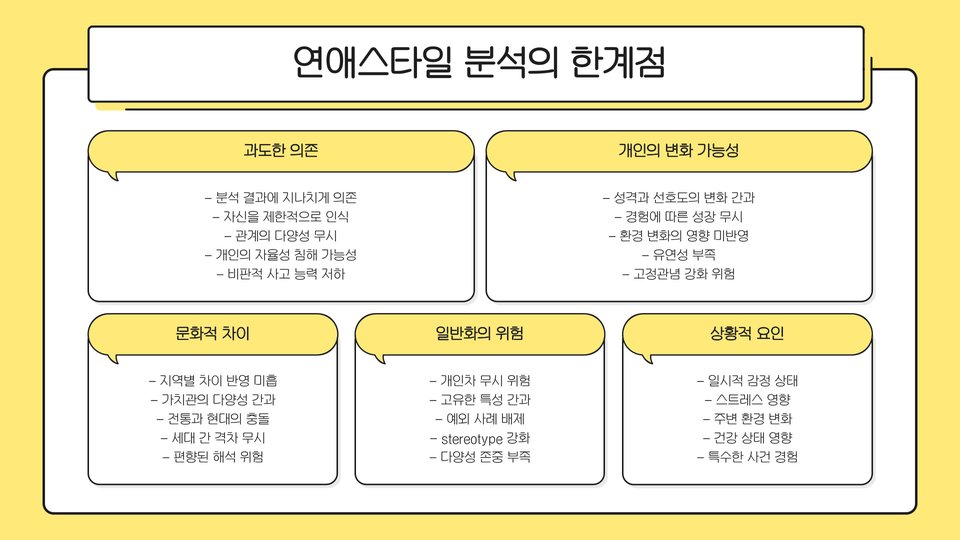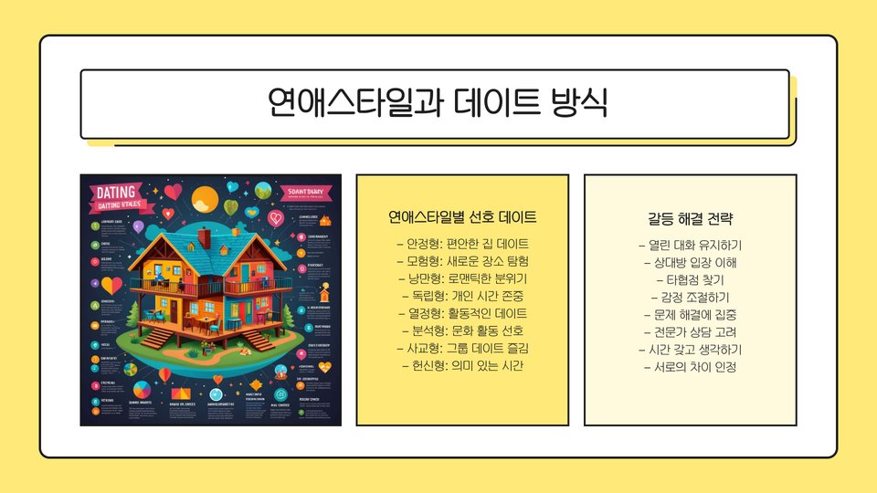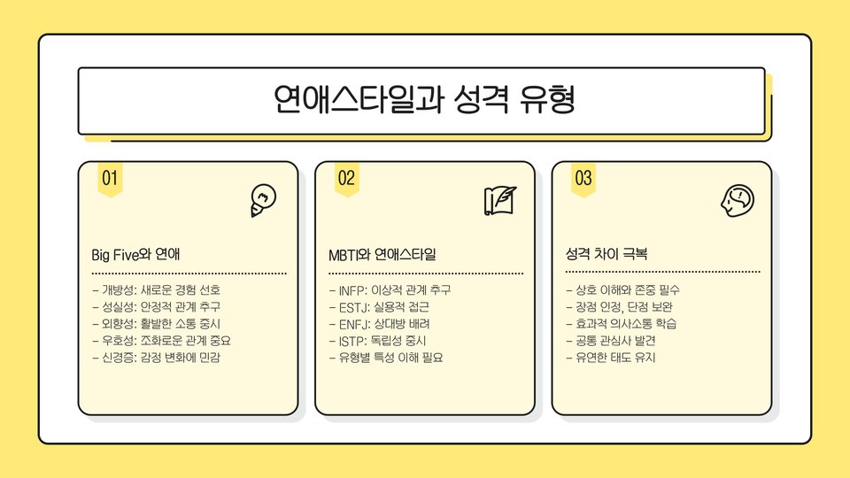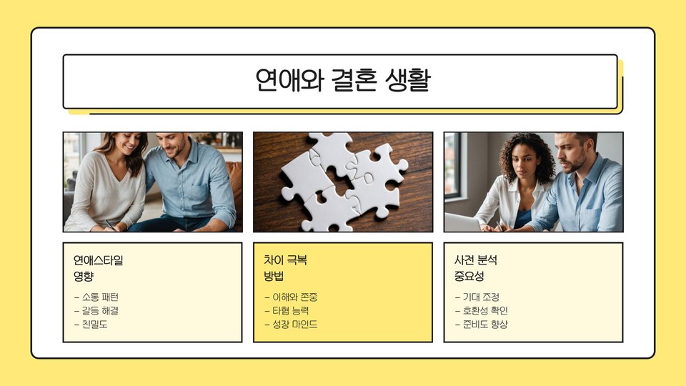 더욱이, 연애스타일을 이해하는 것은 파트너와의 의사소통을 개선하고 갈등을 줄이는 데 도움이 됩니다. 예를 들어, 만약 한 파트너가 독립적인 성향을 가지고 있다면, 상대방은 이를 존중하고 불필요한 압박을 가하지 않도록 해야 합니다. 이러한 이해는 관계를 더욱 깊고 의미 있게 만들어줍니다.