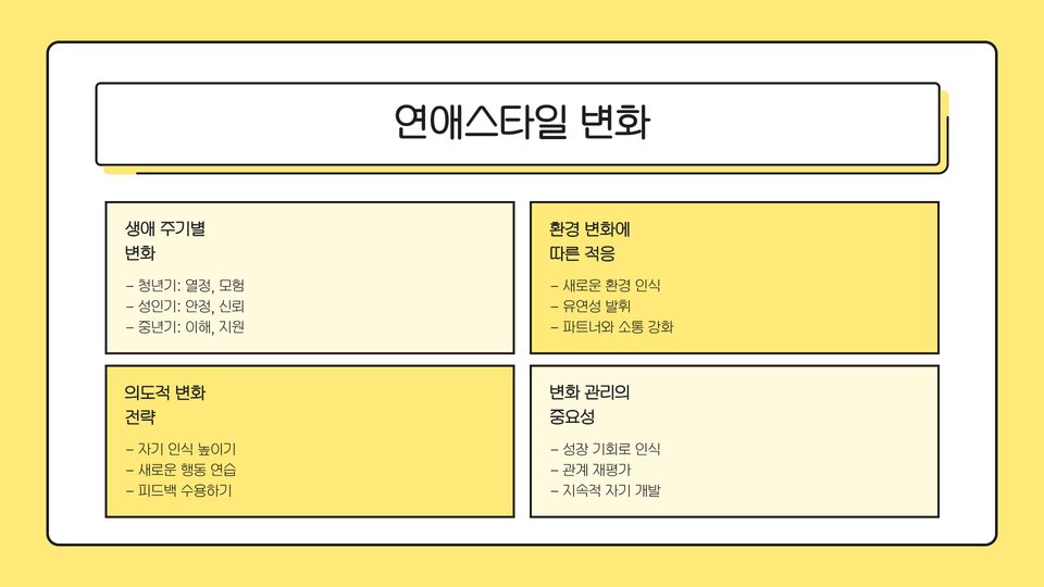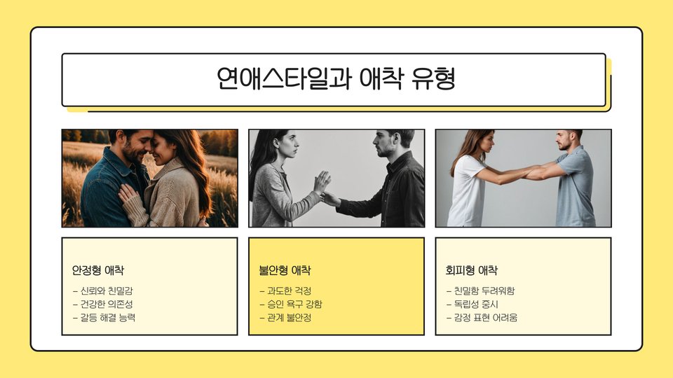 각 스타일은 고유한 특성과 장단점을 가지고 있으며, 이를 이해하는 것이 중요합니다. 자신의 스타일을 알고 적절한 파트너를 찾는 것은 더 행복한 연애를 위한 첫걸음입니다.