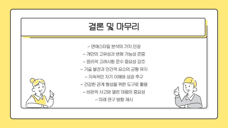 마지막으로, 자신이 원하는 스타일에 맞는 파트너를 찾는 데 집중해야 합니다. 상대방의 연애스타일을 이해하고 존중하는 것이 관계의 성공에 큰 영향을 미친다는 점을 명심하세요.