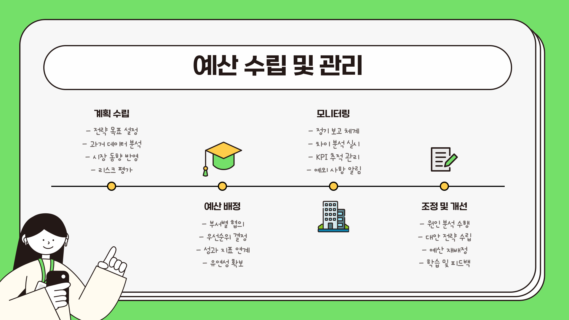 | 예산 수립 및 관리 | 부서별 예산 운영 및 초과 지출 방지 |