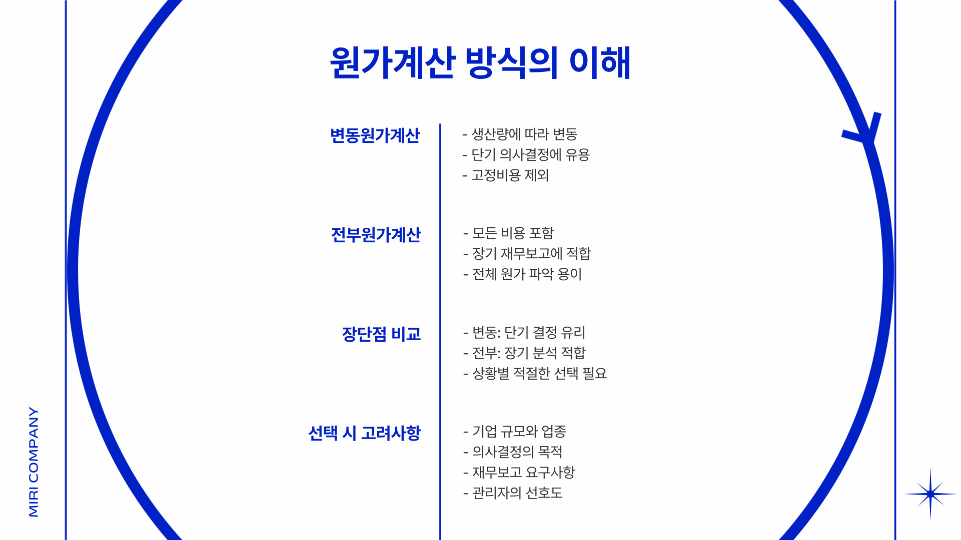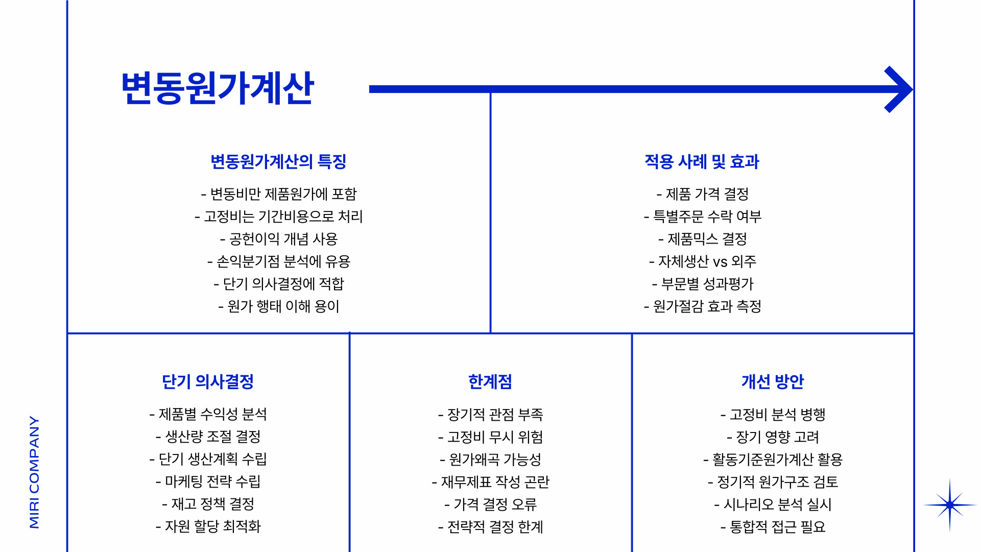 - 전부원가계산: 모든 비용을 포함하여 장기적 분석에 적합