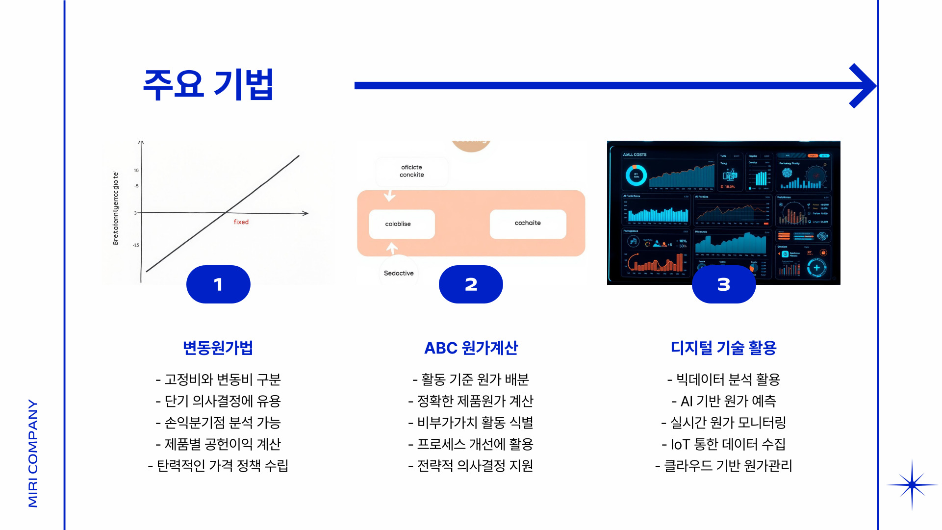 - 변동원가법, 표준원가법, 활동기준원가계산(ABC)과 같은 기법이 있습니다.