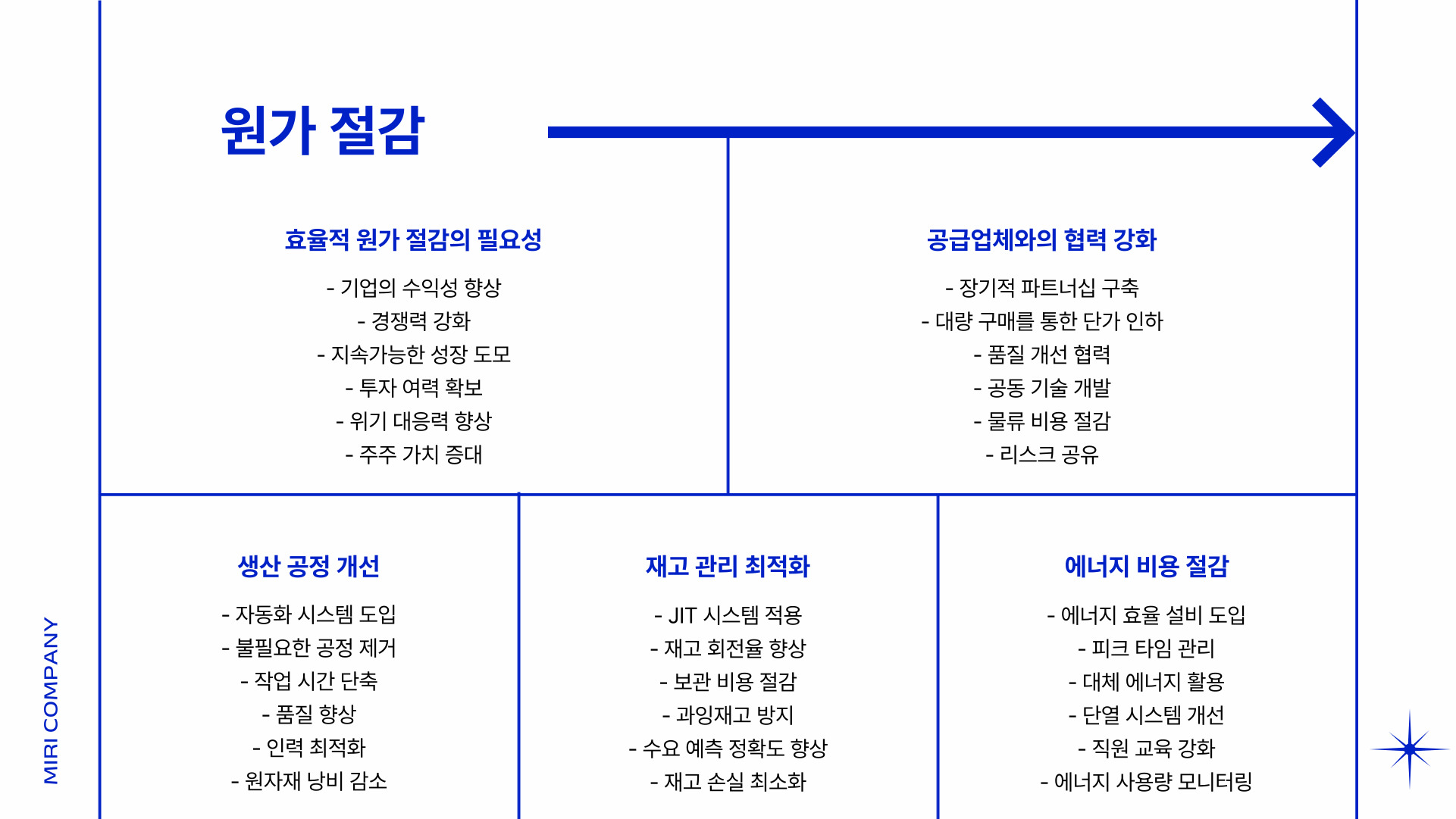 효율적인 원가 절감을 위해 다양한 전략을 세워야 합니다. 예를 들어, 공급업체와의 협력 강화를 통해 원자재 비용을 절감하거나, 생산 공정을 개선하여 인건비를 줄일 수 있습니다. 원가 절감 전략은 장기적으로 기업의 수익성을 높이는 데 기여합니다.
