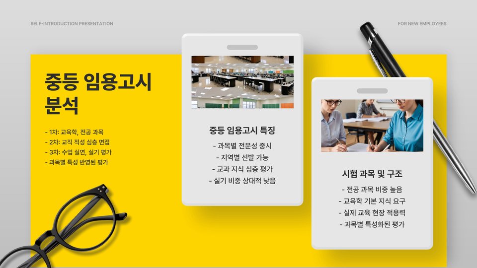 - 중등학교 임용고시는 전문 과목에 대한 깊은 이해가 필수적이다.