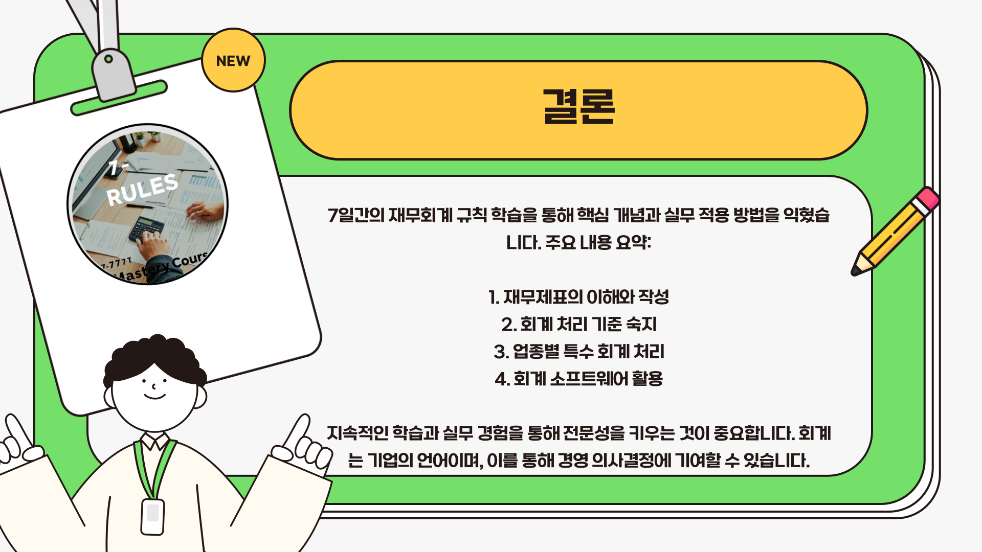 재무회계 규칙을 단 7일 동안 마스터하는 것은 도전적일 수 있지만, 위에서 언급한 비법을 통해 충분히 가능하다는 것을 알 수 있습니다. 기본 개념을 이해하고, 회계 원칙을 배우며, 재무제표를 작성하고, 정기적인 감사의 중요성을 인식하는 것이 핵심입니다. 이 모든 과정을 통해 여러분은 재무회계의 전문가로 성장할 수 있습니다.