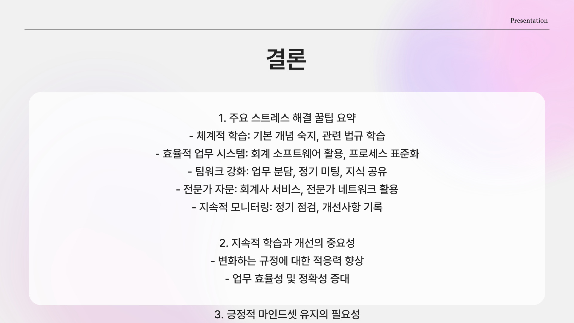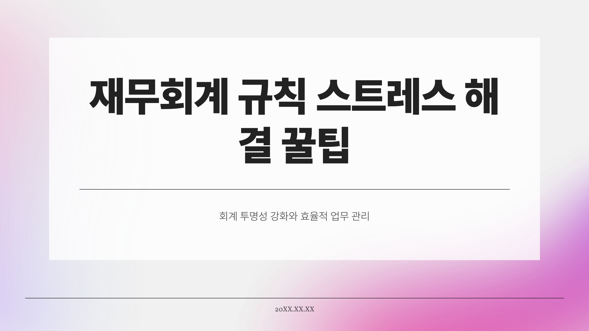 재무회계 규칙은 기업 운영에 있어 필수적이지만, 스트레스를 유발할 수 있는 요소이기도 합니다. 위에서 제시한 여러 가지 방법을 활용하여 스트레스를 줄이고, 효율적인 재무 관리가 이루어지기를 바랍니다. 지속적인 교육과 팀워크, 그리고 프로세스 자동화는 재무회계 스트레스를 줄이는 데 큰 도움이 됩니다. 이 모든 방법을 통해 더 나은 회계 환경을 만들어 나가시길 바랍니다.