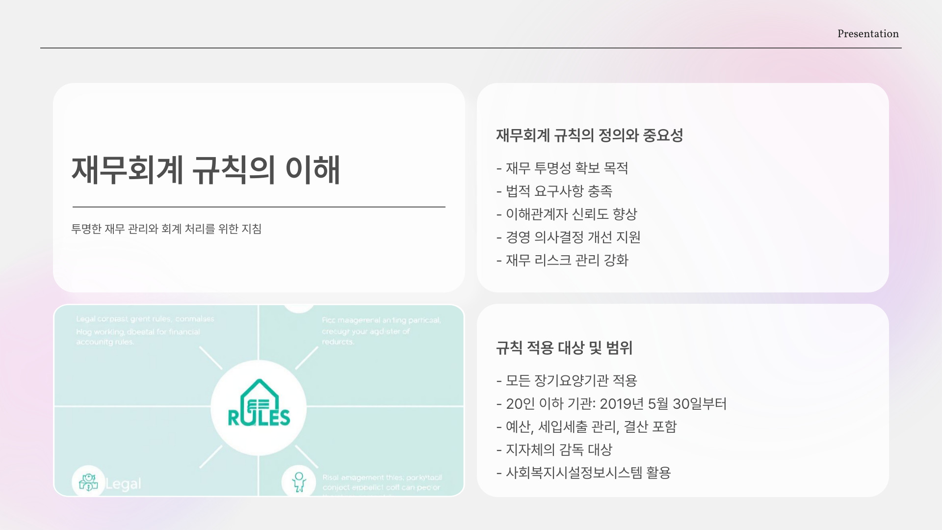 - 재무회계 규칙은 기업의 재무 상태를 투명하게 보고하는 데 필수적입니다.