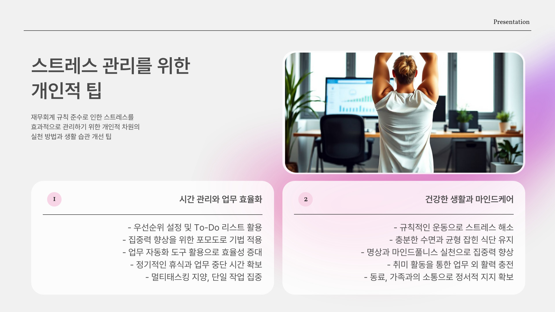 재무회계 업무에서 오는 스트레스를 효과적으로 관리하기 위해서는 평소의 건강 관리가 중요합니다. 신체적, 정신적 건강이 회계 업무의 역량을 향상시킬 수 있기 때문입니다. 다양한 스트레스 해소 방법을 시도해보세요.