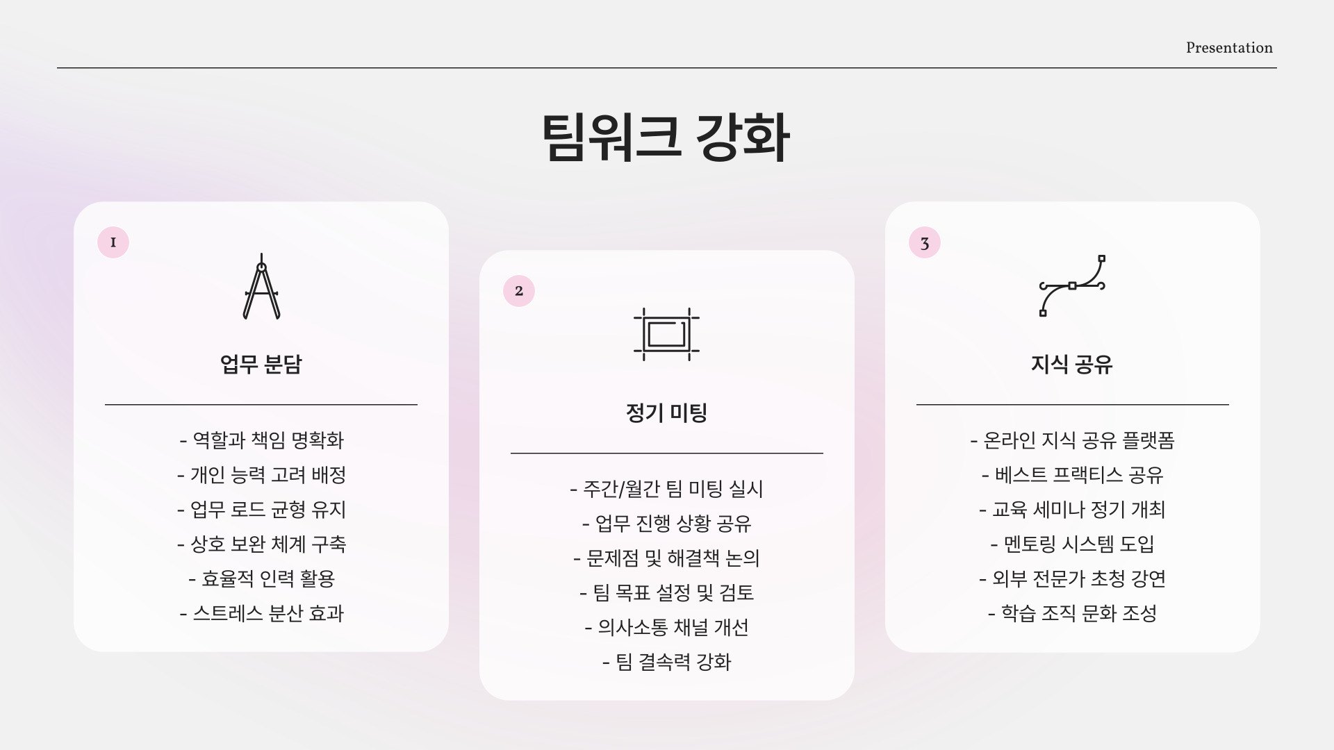 세 번째로, 팀워크 강화입니다. 팀원들 간의 원활한 소통과 협업은 스트레스를 줄이는 데 큰 도움이 됩니다. 주기적인 회의를 통해 문제를 공유하고, 각자의 역할을 명확히 함으로써 효율성을 높일 수 있습니다.