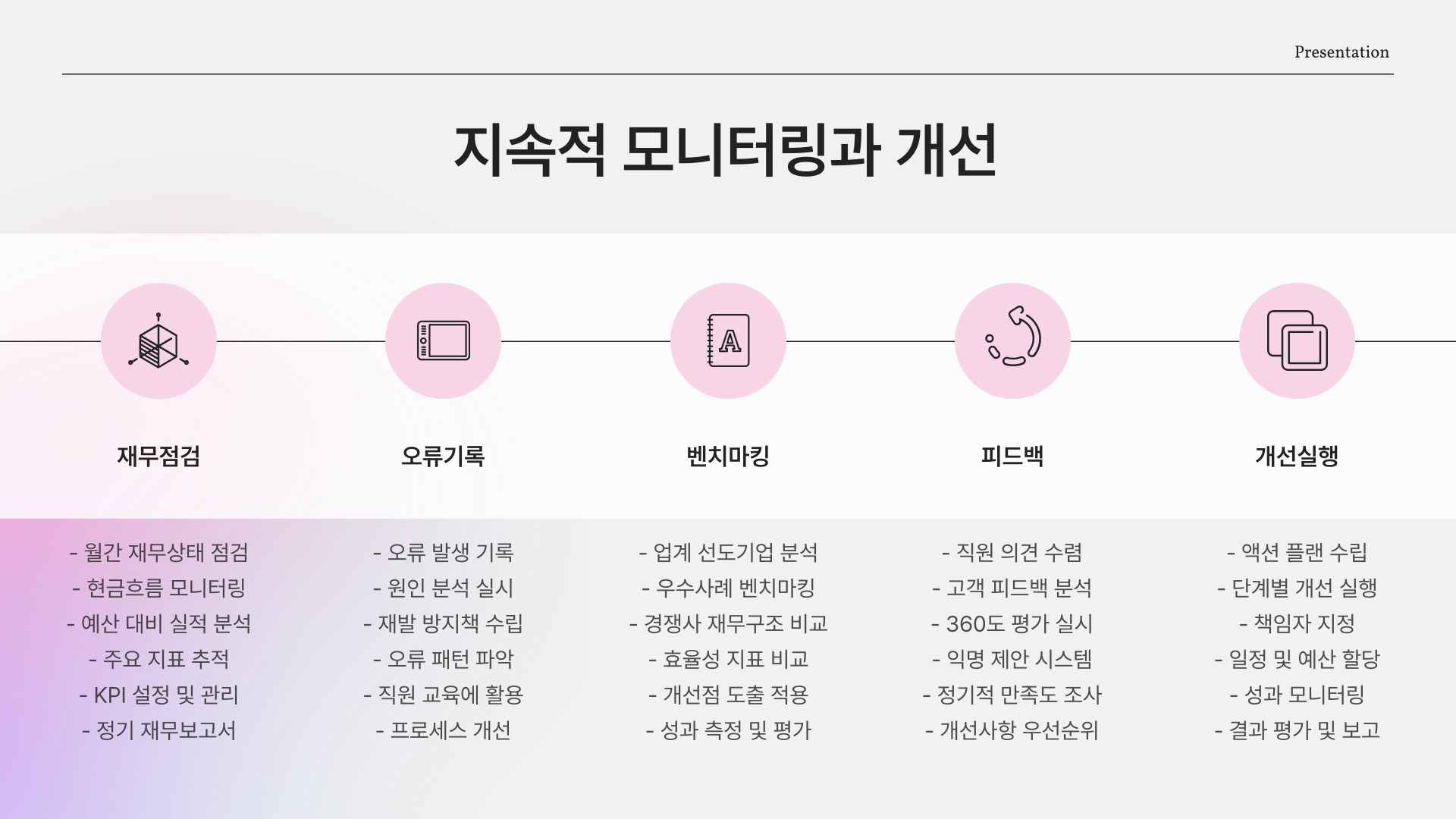 두 번째 항목은 정기적인 내부 감사입니다. 내부 감사를 통해 규칙 준수 여부를 점검하고, 필요한 개선 사항을 도출해야 합니다. 마지막으로, 모든 문서의 기록과 보관입니다. 문서화는 회계의 투명성을 높이고, 필요 시 쉽게 접근할 수 있도록 돕습니다.