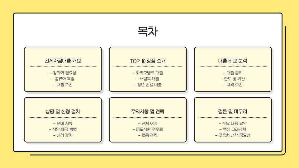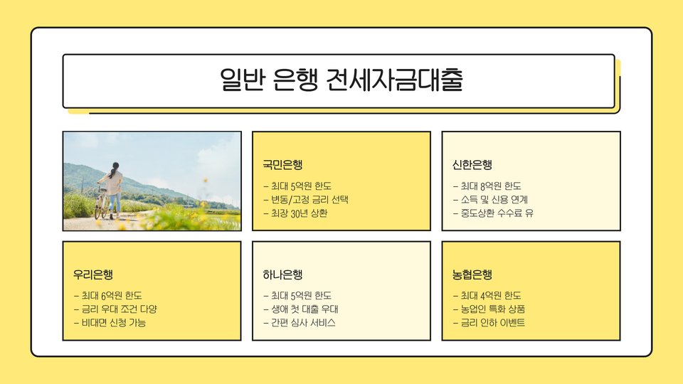 - 6. 농협은행: 다양한 전세자금 대출 상품을 제공하며, 지역밀착형 서비스를 제공합니다.