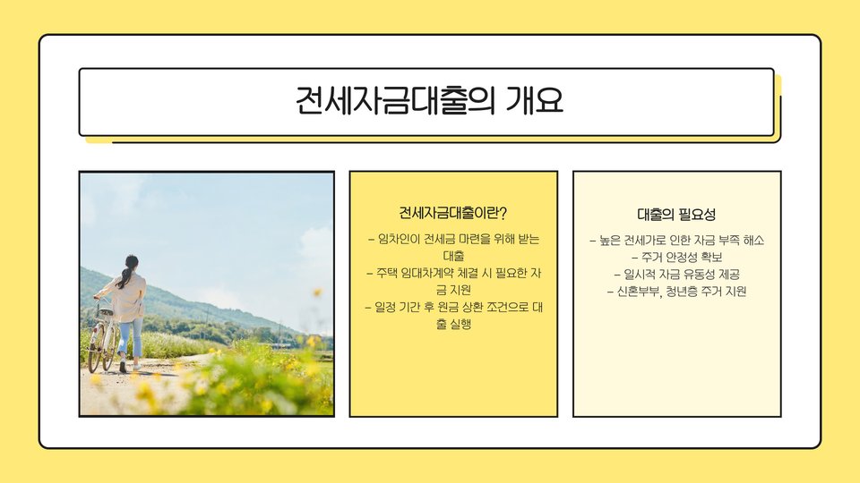 전세자금대출은 주택을 전세로 임대하기 위해 필요한 자금을 대출받는 것을 의미합니다. 보통 주택의 전세 보증금의 일부를 은행에서 대출받아 집주인에게 지급하게 됩니다. 이러한 대출은 주로 전세자금대출 상품이라고 불리며, 대출 조건이 다양하므로 잘 비교하여 상담받는 것이 중요합니다. 특히 대출 금리, 상환 기간, 한도 등을 고려해야 합니다.