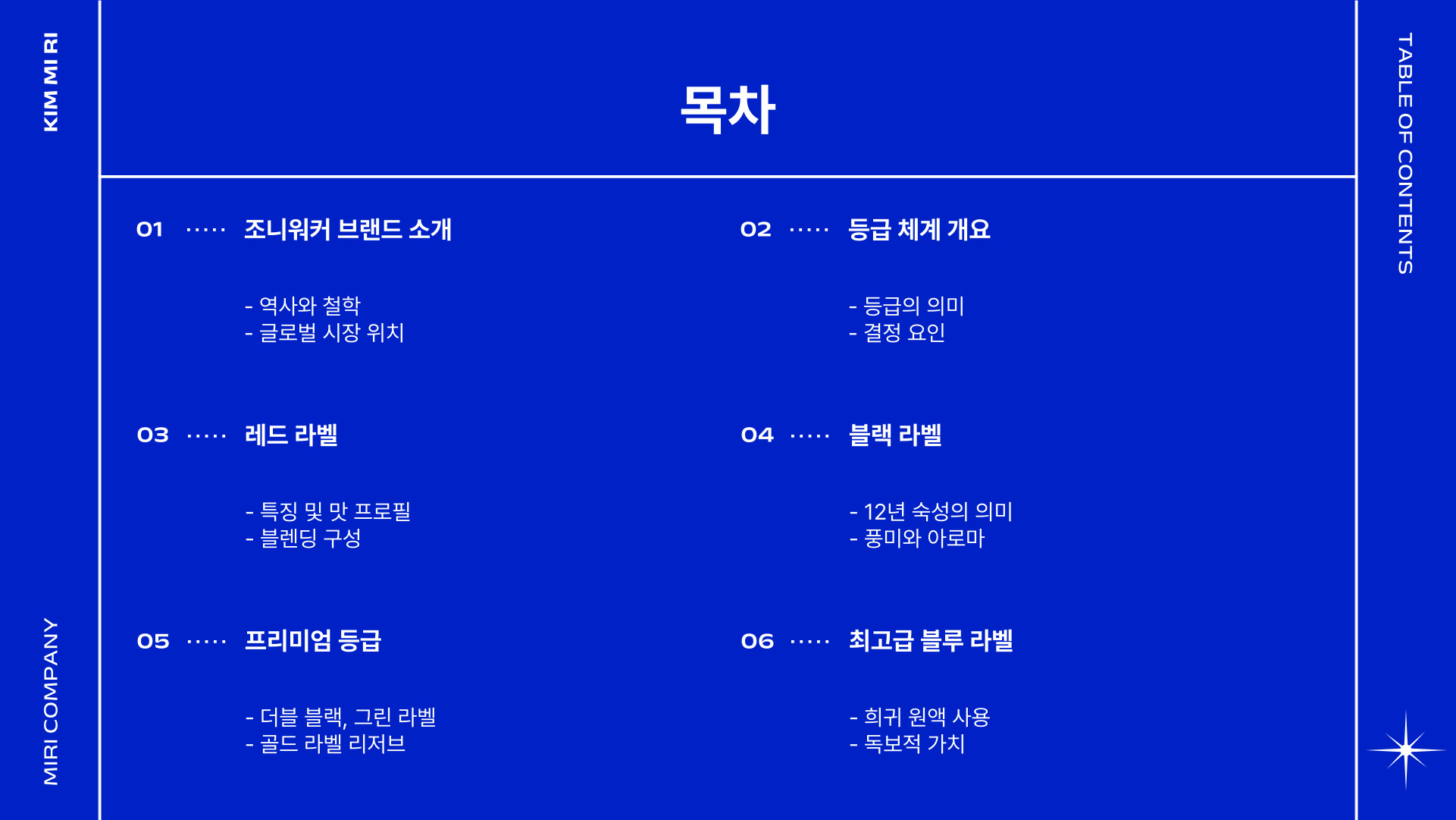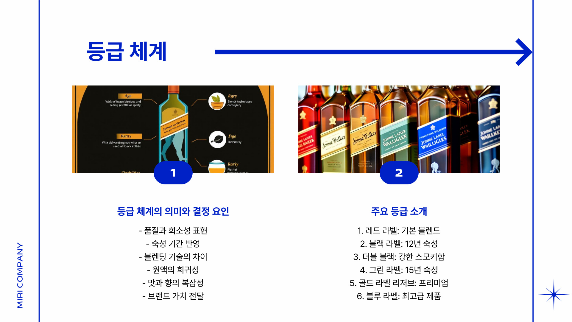 - 조니워커는 다양한 등급으로 나뉘어 있으며, 각 등급은 독특한 맛과 향을 가지고 있습니다.