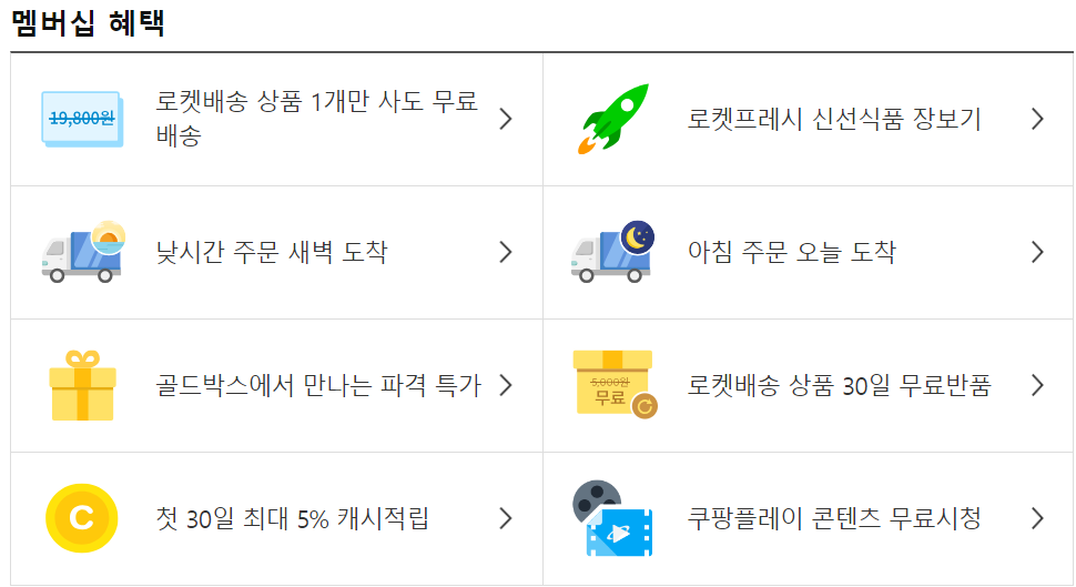 쿠팡 와우 회원가입을 하면 받을 수 있는 혜택 입니다. 쿠팡을 자주 사용하신다면 가입 하기를 추천 드립니다.