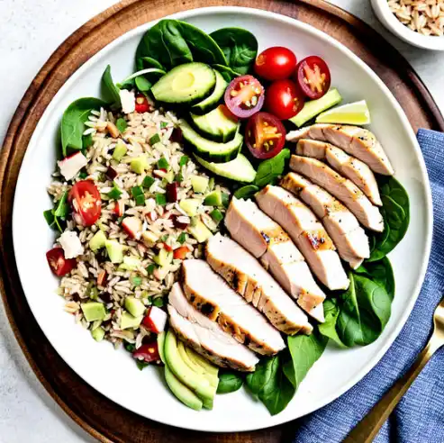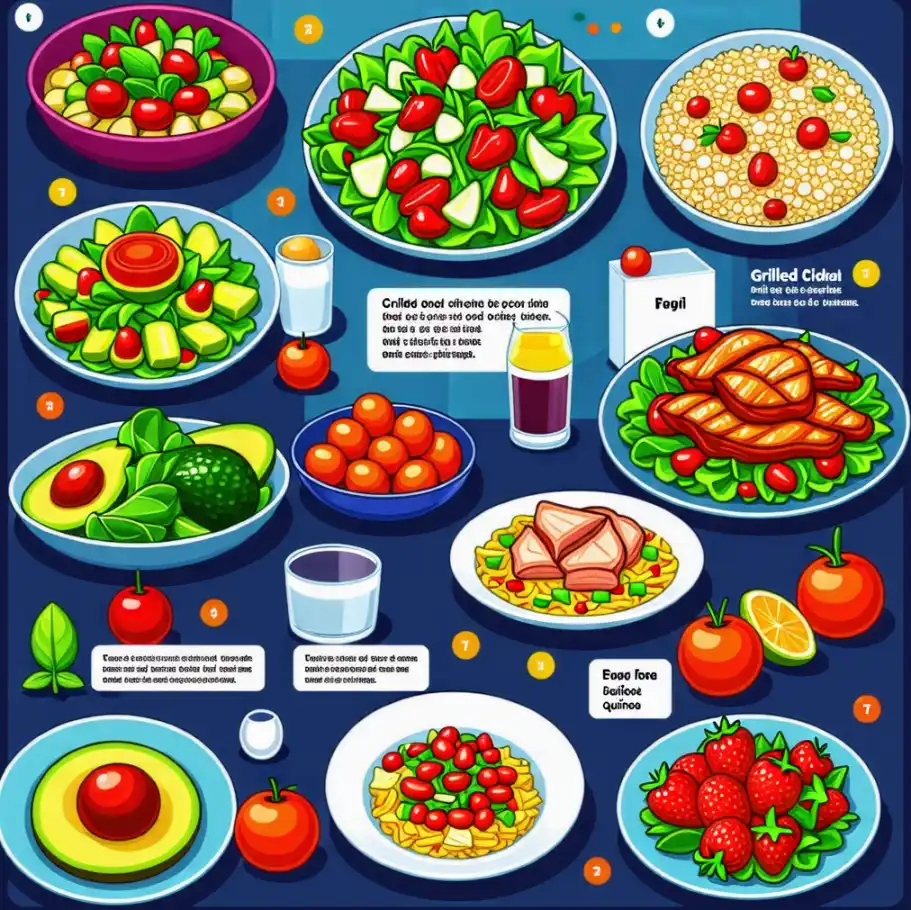 - 균형 잡힌 식단 구성: 단백질(닭가슴살, 생선, 두부 등), 탄수화물(현미, 고구마, 통곡물 빵 등), 건강한 지방(아보카도, 올리브 오일, 견과류 등), 다양한 채소와 과일을 골고루 포함시킵니다.