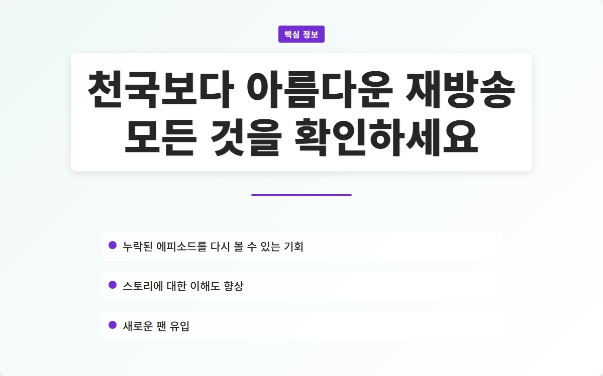 천국보다 아름다운의 재방송은 단순한 반복 방송이 아니라, 많은 이들에게 감동과 교훈을 주는 소중한 기회입니다. 이 드라마의 매력을 다시 한번 느끼고 싶은 분들은 재방송 일정을 꼭 체크해보세요. 드라마를 통해 새로운 감동을 경험할 수 있는 기회를 놓치지 마세요!