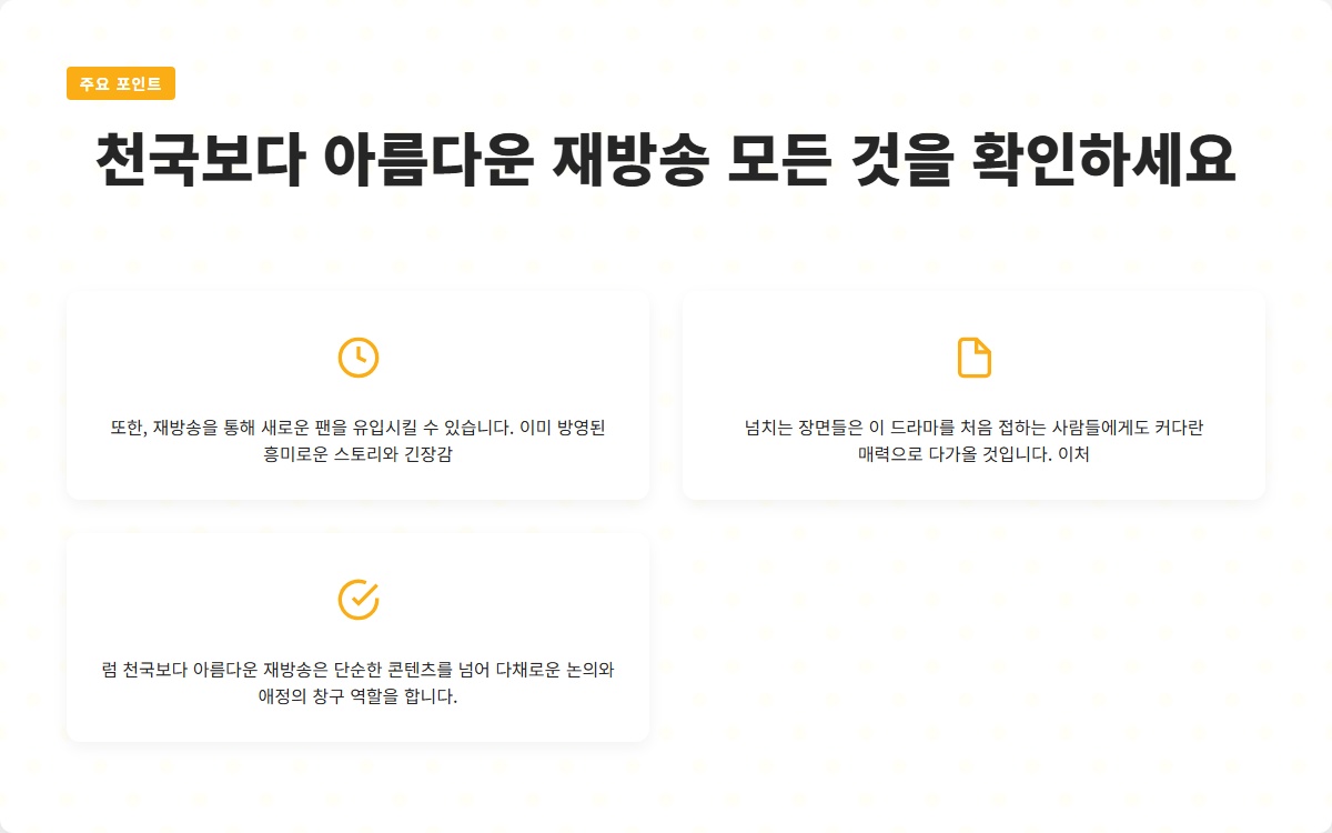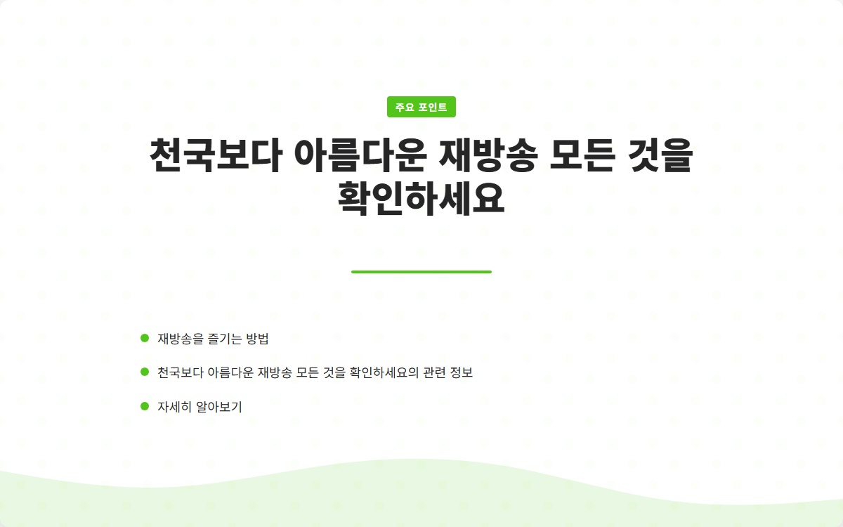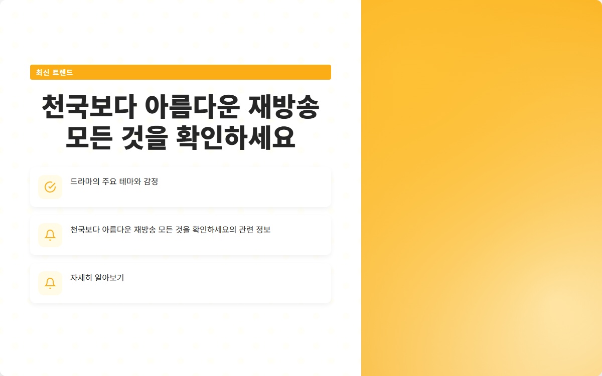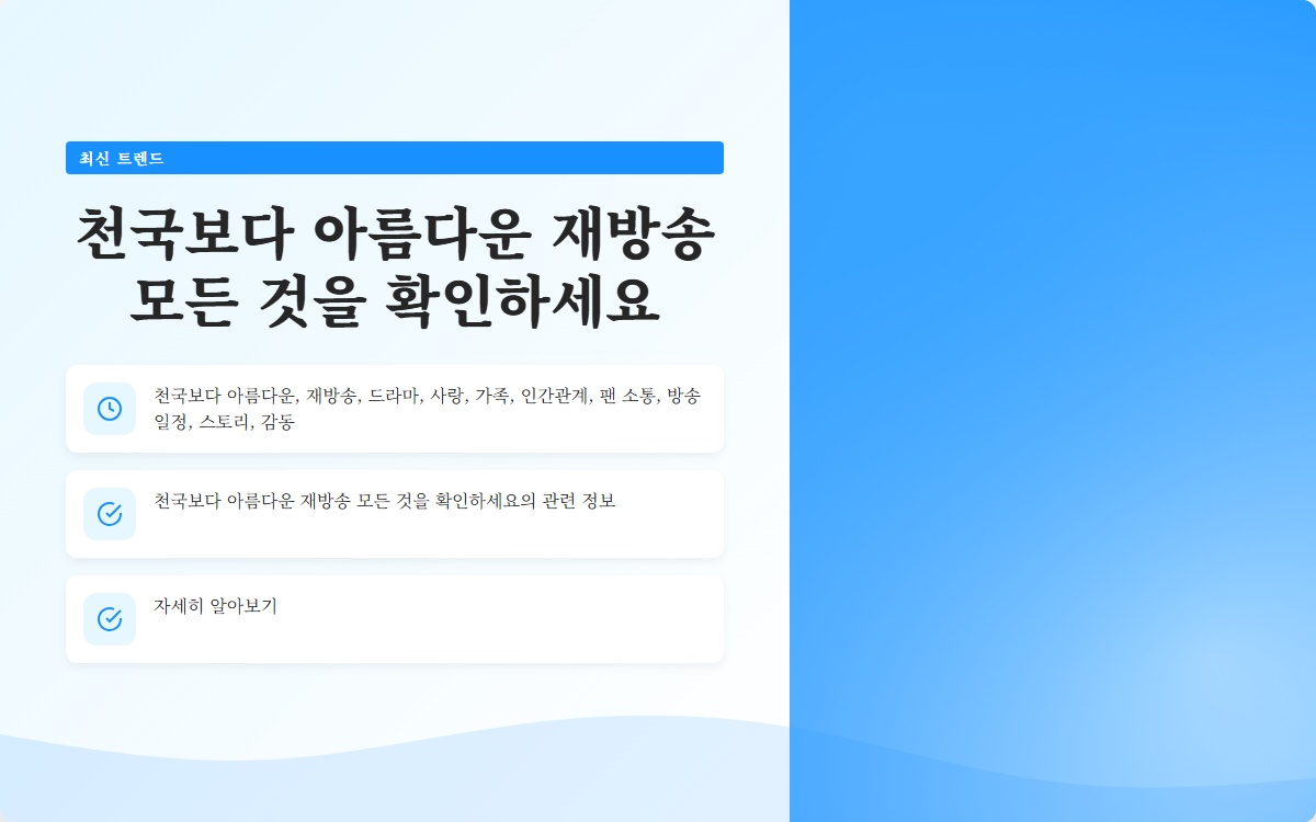 천국보다 아름다운의 재방송은 단순한 반복 방송이 아니라, 많은 이들에게 감동과 교훈을 주는 소중한 기회입니다. 이 드라마의 매력을 다시 한번 느끼고 싶은 분들은 재방송 일정을 꼭 체크해보세요. 드라마를 통해 새로운 감동을 경험할 수 있는 기회를 놓치지 마세요!