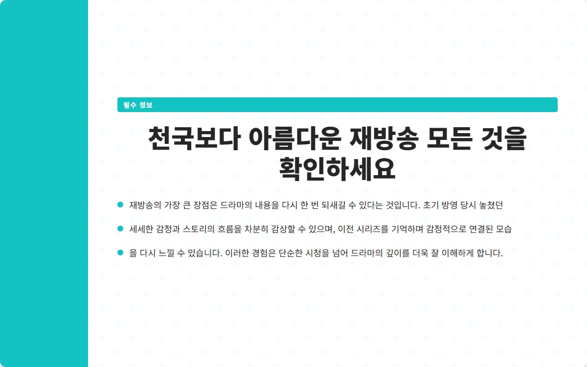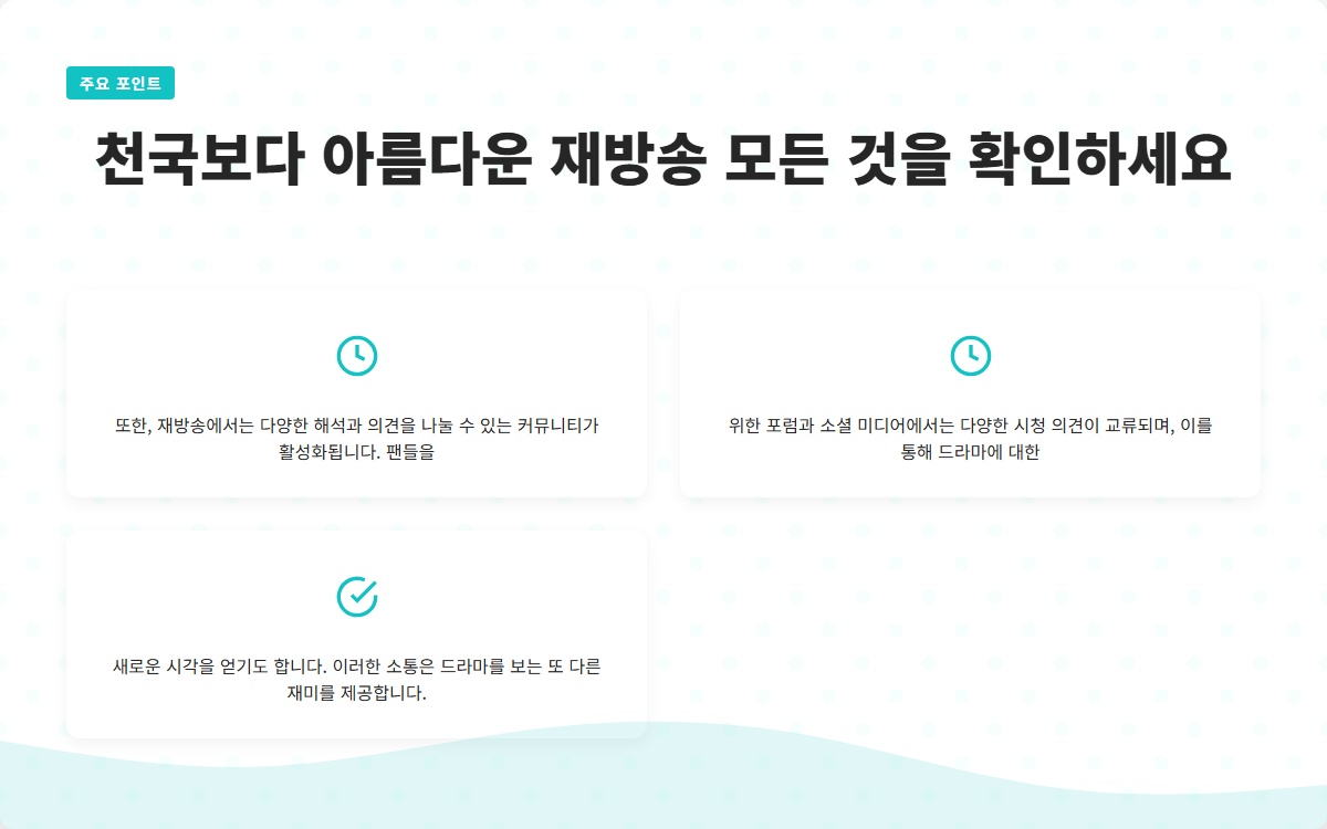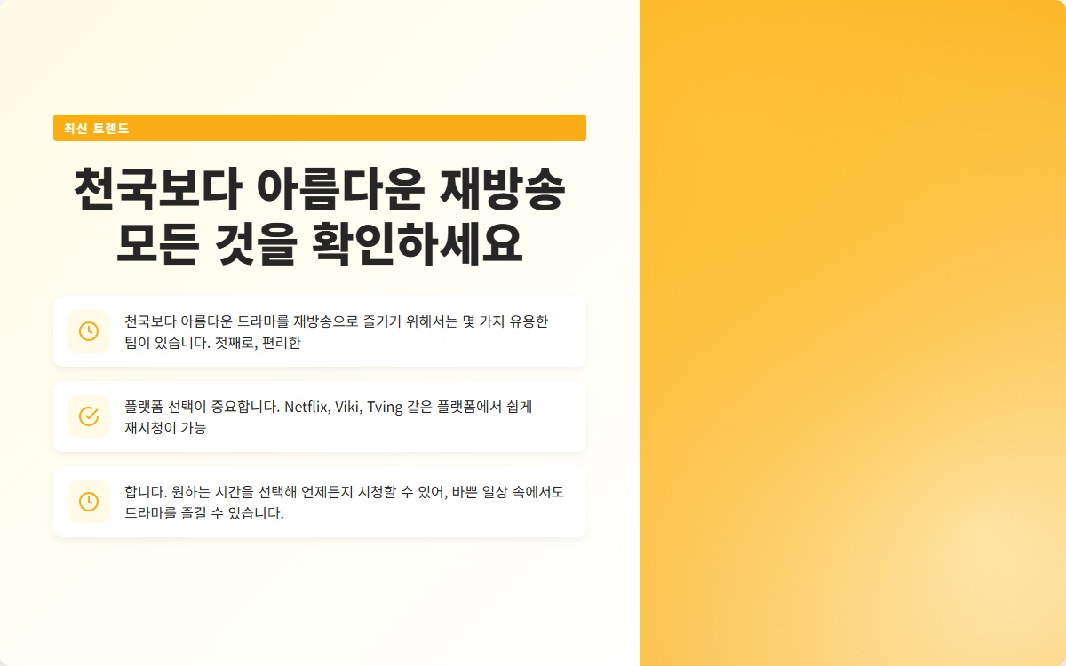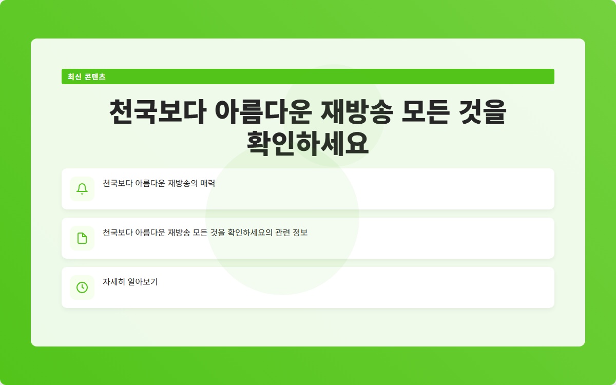 천국보다 아름다운의 재방송은 단순한 반복 방송이 아니라, 많은 이들에게 감동과 교훈을 주는 소중한 기회입니다. 이 드라마의 매력을 다시 한번 느끼고 싶은 분들은 재방송 일정을 꼭 체크해보세요. 드라마를 통해 새로운 감동을 경험할 수 있는 기회를 놓치지 마세요!