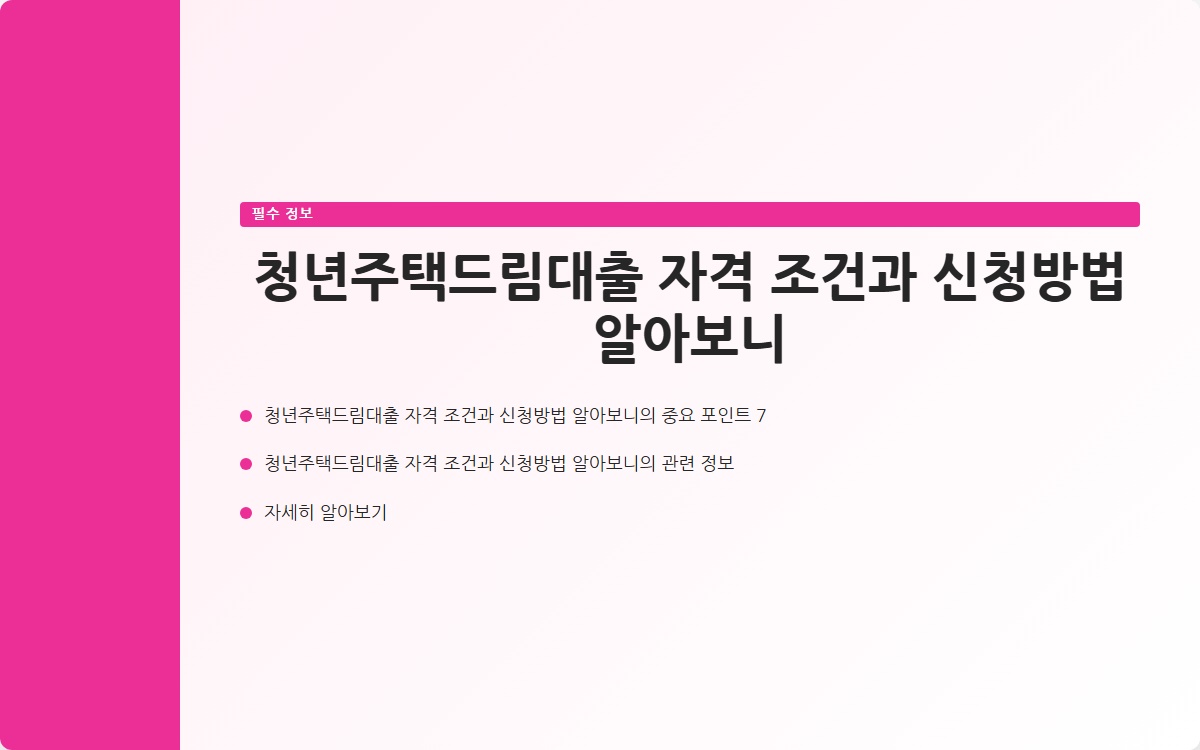 최근 청년층을 위한 다양한 지원 정책이 시행되고 있습니다. 그중에서도 청년 드림통장은 많은 관심을 받고 있는 제도입니다. 특히 청년주택드림대출은 주택 구매를 원하는 청년들에게 큰 도움이 되고 있습니다. 이번 포스팅에서는 청년주택드림대출의 자격 조건과 신청 방법에 대해 자세히 알아보겠습니다.