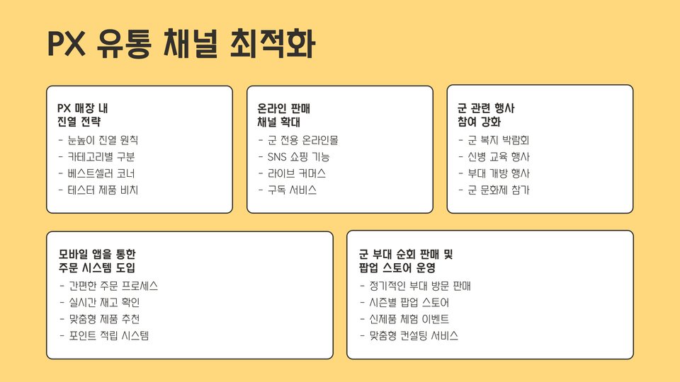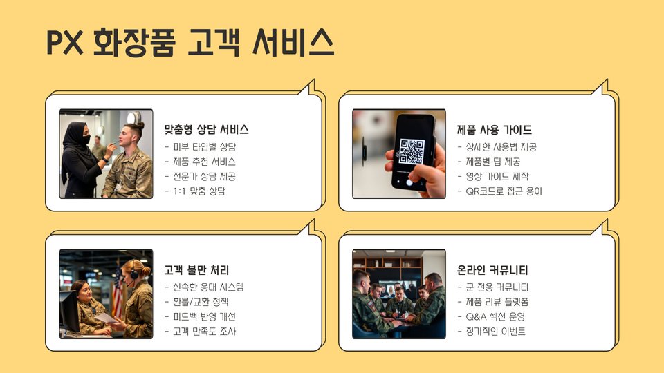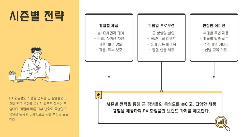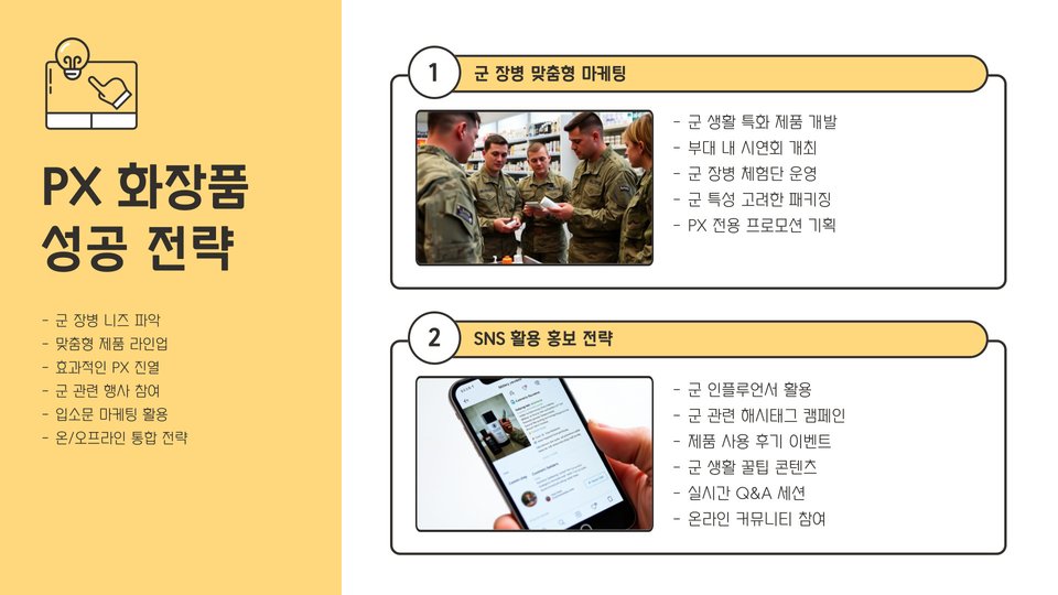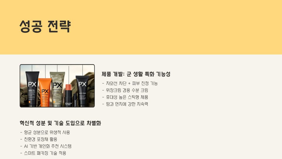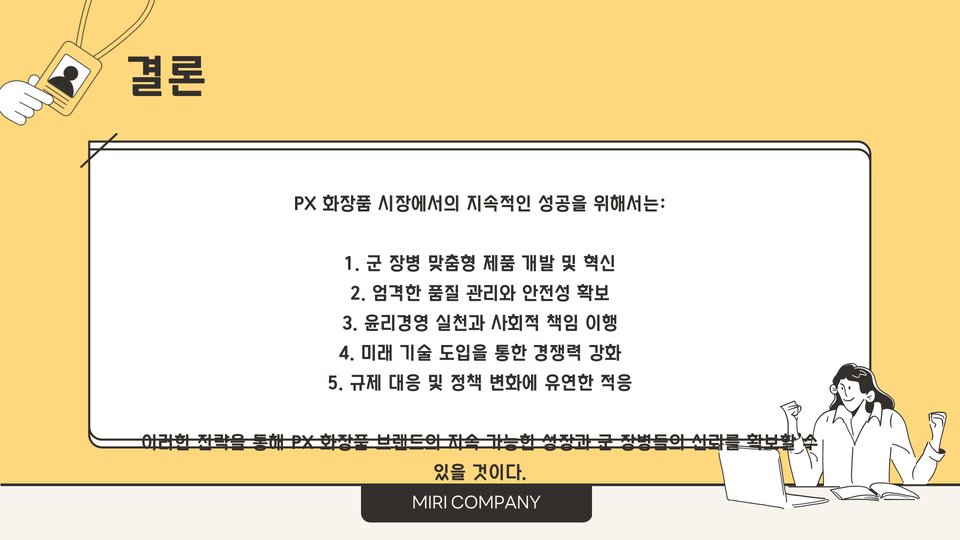 마지막으로, px 화장품의 성공을 위해서는 효과적인 마케팅 전략과 유통 채널이 반드시 필요합니다. 디지털 플랫폼을 활용하여 고객과의 직접적인 소통 채널을 강화하는 것이 좋습니다. 홈페이지와 소셜 미디어 채널에서 소비자와의 상호작용을 통해 트렌드에 즉각적으로 대응할 수 있습니다.