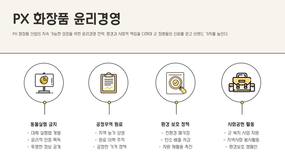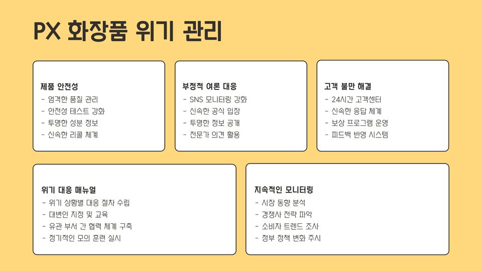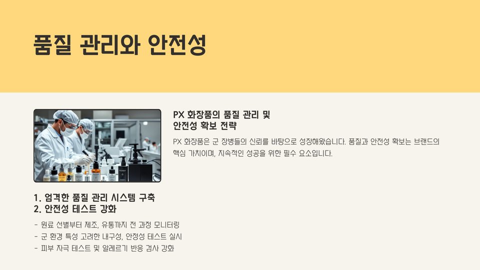 마지막으로, px 화장품은 품질 관리와 혁신을 지속적으로 추구해야 합니다. 고객의 기대를 초과하는 품질을 제공하기 위해서는 철저한 품질 관리를 통해 제품의 일관성을 유지해야 합니다. 품질 불량이 발생할 경우, 브랜드 이미지에 큰 타격을 줄 수 있으므로 주의가 필요합니다.