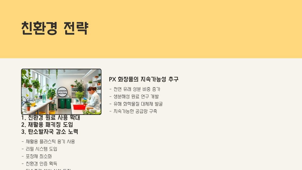먼저, px 화장품의 성공을 위해서는 현재의 트렌드를 분석하고 소비자의 니즈를 파악하는 것이 중요합니다. 최근 소비자들은 자연 성분을 선호하고 있으며, 지속 가능한 제품에 대한 수요가 증가하고 있습니다. 따라서 자연 친화적인 성분을 활용한 제품 개발이 필요합니다.