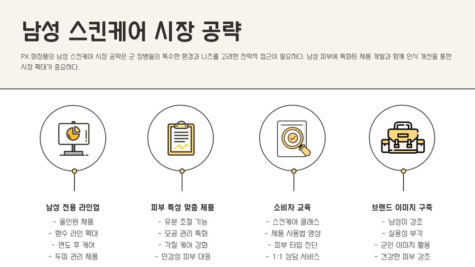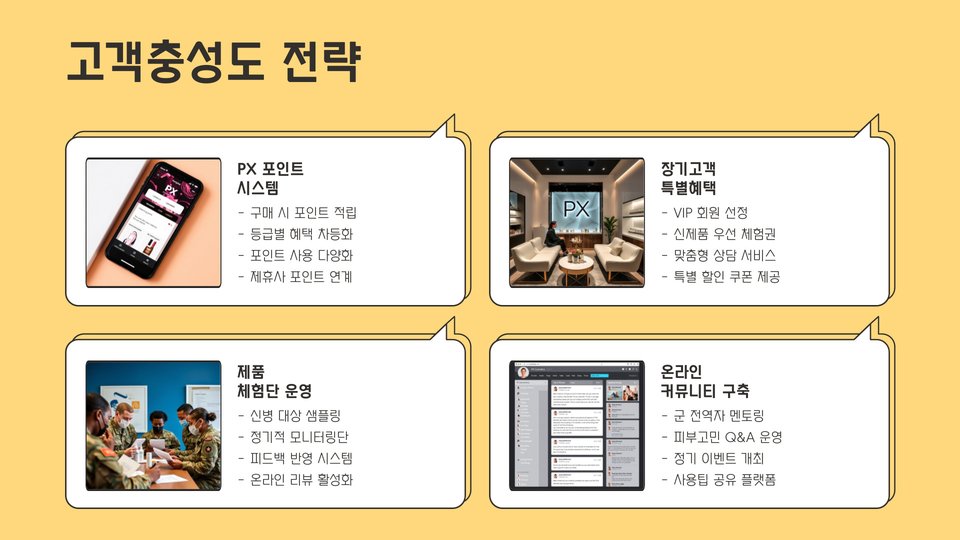 마지막으로, px 화장품의 성공을 위해서는 효과적인 마케팅 전략과 유통 채널이 반드시 필요합니다. 디지털 플랫폼을 활용하여 고객과의 직접적인 소통 채널을 강화하는 것이 좋습니다. 홈페이지와 소셜 미디어 채널에서 소비자와의 상호작용을 통해 트렌드에 즉각적으로 대응할 수 있습니다.