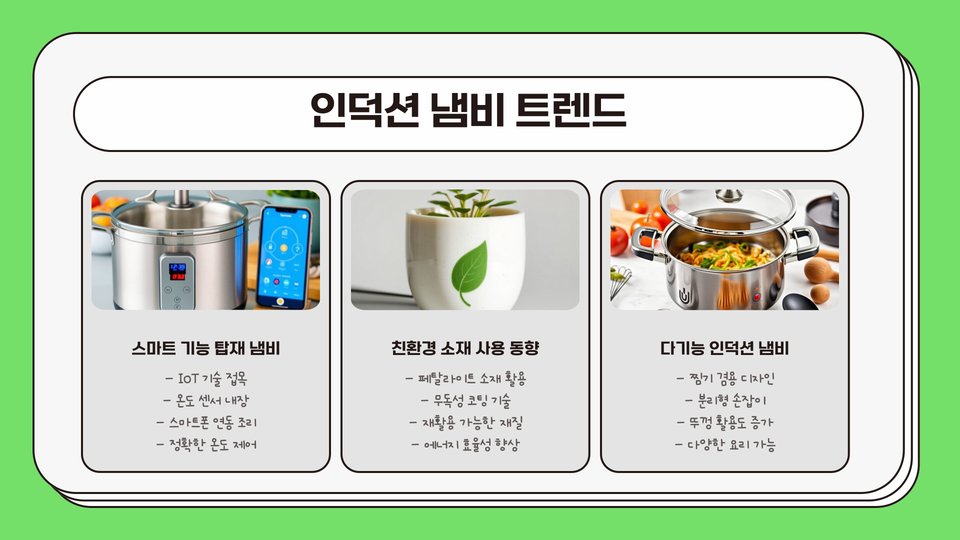 또한, 바닥이 평평하고 두꺼운 냄비를 선택해야 인덕션의 효율성을 더욱 높일 수 있습니다. 이러한 특성을 갖춘 냄비는 열이 고르게 전달되어 조리 시간이 단축됩니다. 요즘은 온라인 쇼핑이 발달해 다양한 브랜드와 스타일의 냄비를 쉽게 찾아볼 수 있으니, 신중하게 결정해야 합니다.