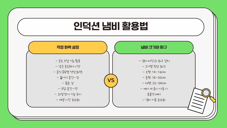 예를 들어, 인덕션 조리가 처음이라면 중불과 약불을 사용해 요리를 시작하는 것이 좋습니다. 가스레인지에 비해 조리 속도가 빠르므로, 긴 요리 시간 동안 불 조절에 유의해야 합니다. 특히 예민한 식재료를 다룰 때는 조리 시간이 길어지면 상할 수 있으므로, 꼼꼼한 확인이 필수입니다.