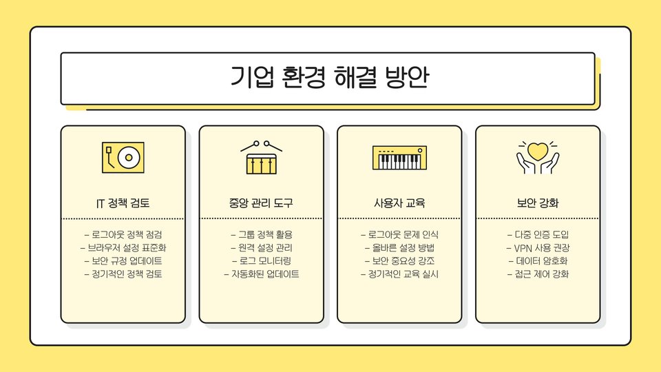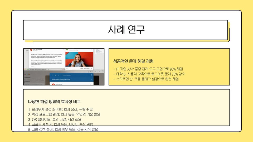 이 외에도, 브라우저 업데이트를 통해 최신 버전으로 유지하는 것도 중요합니다. 버그가 수정된 새로운 버전을 사용하면 문제 해결에 도움이 될 수 있습니다. 마지막으로, 보안 설정 점검을 통해 불필요한 보안 기능을 비활성화하는 것도 고려해볼 수 있습니다. 이러한 방법들은 모두 로그아웃 문제를 해결하는 데 효과적일 수 있습니다.
