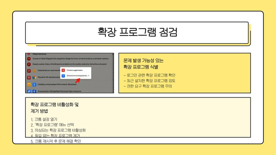 또한, 확장 프로그램 비활성화도 고려해볼 수 있습니다. 특정 확장 프로그램이 로그인 세션에 문제를 일으킬 수 있으므로, 모든 확장 프로그램을 비활성화한 후 문제가 해결되는지 확인하는 것이 좋습니다. 이 과정에서 하나씩 활성화하여 어떤 프로그램이 문제를 일으키는지 파악할 수 있습니다.