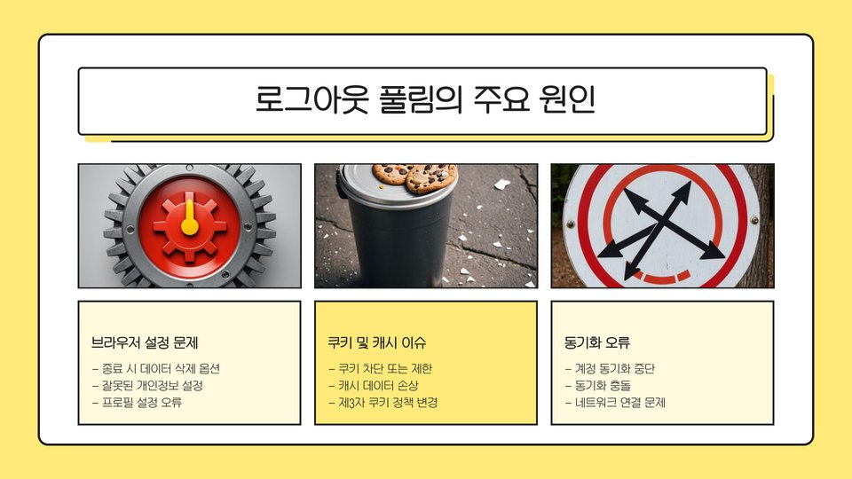 크롬 브라우저에서 로그아웃이 풀리는 원인은 다양합니다. 가장 흔한 원인 중 하나는 쿠키 문제입니다. 브라우저의 쿠키가 손상되거나 만료되면, 로그인 상태가 유지되지 않을 수 있습니다. 또 다른 원인은 브라우저 캐시입니다. 캐시된 데이터가 문제를 일으킬 수 있으며, 이로 인해 로그아웃이 풀릴 수 있습니다.