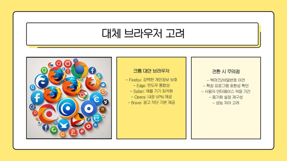 일부 사용자는 크롬의 로그아웃 문제를 겪으며 다른 브라우저로의 전환도 고려하게 됩니다. 크롬에서 특정 기능이나 사이트가 제대로 작동하지 않는 경우, Firefox나 Edge 같은 다른 브라우저에서 사용하는 것도 하나의 방법이 될 수 있습니다. 이미 익숙한 크롬 대신 새로운 브라우저에 적응하는 것이 다소 어려울 수 있지만, 장기적으로 볼 때 더 나은 경험을 제공할 수 있습니다.