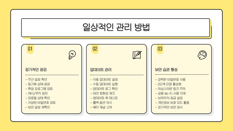 크롬 브라우저를 더욱 안전하고 효율적으로 사용하기 위해, 위의 팁들을 참고하시기 바랍니다. 문제를 경험했을 때는 당황하지 말고 차근차근 해결해 보세요.