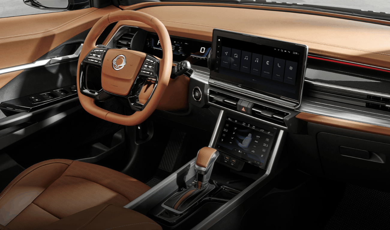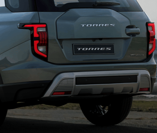토레스는 튼튼하고 강한 SUV의 느낌을 강조하려고 했습니다. 차량의 각진 라인과 전면부의 미래지향적인 헤드램프 디자인은 단단하고 강한 느낌을 전달합니다. 또한 크게 디자인된 사이드 미러는 차의 크기를 더욱 강조하여 멋진 인상을 줍니다. 차량의 전면부에 있는 라디에이터 부분은 검은색 계열의 마감으로 디자인되어 있습니다.