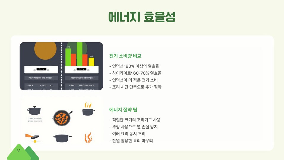- 일반 인덕션: 빠른 조리 시간, 높은 에너지 효율성