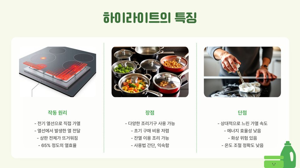 - 하이라이트 인덕션: 가격 저렴, 다양한 조리 기구 사용 가능