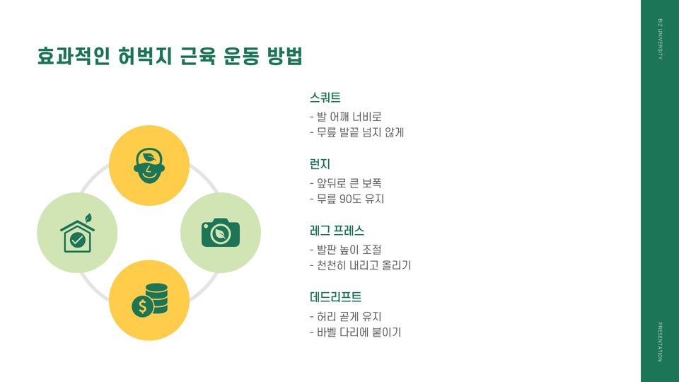 | 추천 운동 | 스쿼트, 런지, 레그 프레스 |