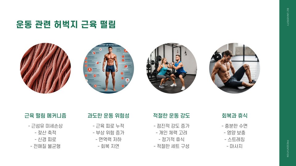 허벅지 근육의 떨림은 다양한 원인에 의해 발생할 수 있습니다. 주로 운동 후 피로, 탈수, 또는 근육의 과도한 긴장 때문입니다. 예를 들어, 운동을 한 후 충분한 수분을 섭취하지 않으면 근육이 떨릴 수 있습니다. 또한, 새로운 운동을 시작하거나 강도를 높일 때도 나타날 수 있습니다. 이는 근육이 새로운 자극에 적응하는 과정에서 발생하는 자연스러운 현상입니다. 이러한 떨림이 지속되면 반드시 전문가와 상담해야 합니다.