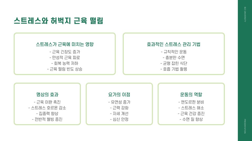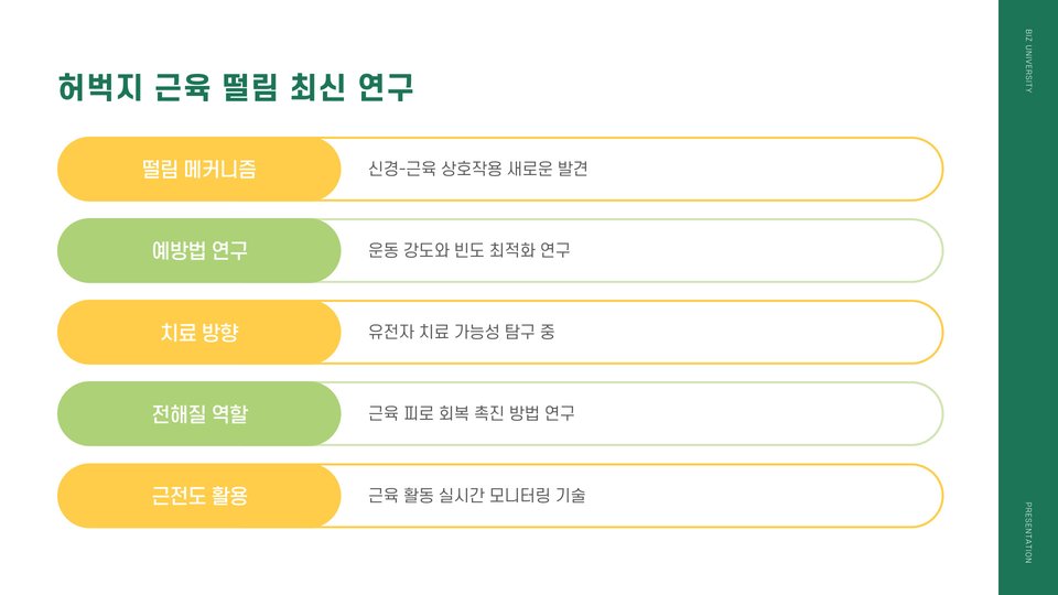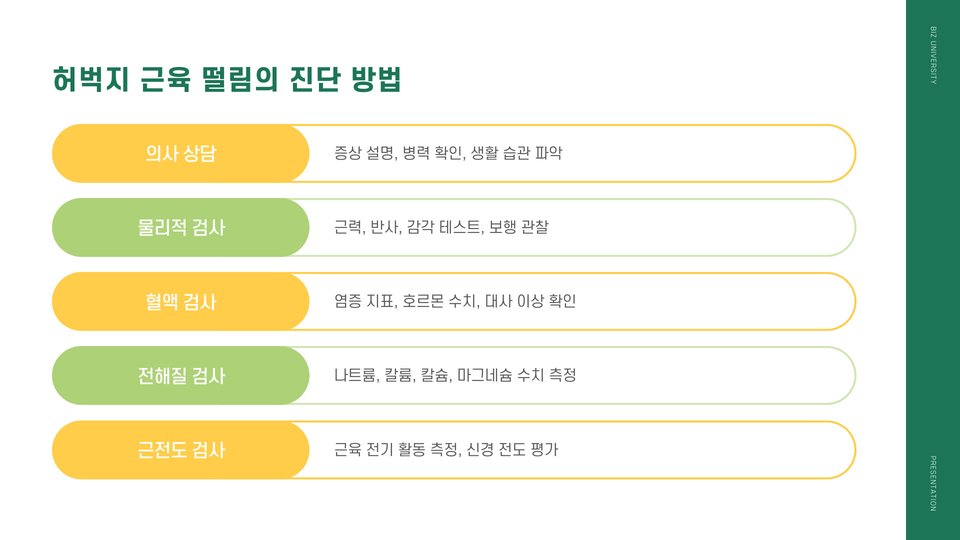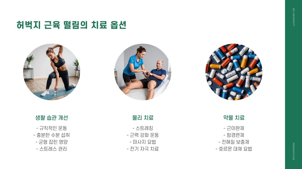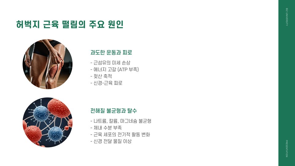 허벅지 근육의 떨림은 다양한 원인에 의해 발생할 수 있습니다. 주로 운동 후 피로, 탈수, 또는 근육의 과도한 긴장 때문입니다. 예를 들어, 운동을 한 후 충분한 수분을 섭취하지 않으면 근육이 떨릴 수 있습니다. 또한, 새로운 운동을 시작하거나 강도를 높일 때도 나타날 수 있습니다. 이는 근육이 새로운 자극에 적응하는 과정에서 발생하는 자연스러운 현상입니다. 이러한 떨림이 지속되면 반드시 전문가와 상담해야 합니다.
