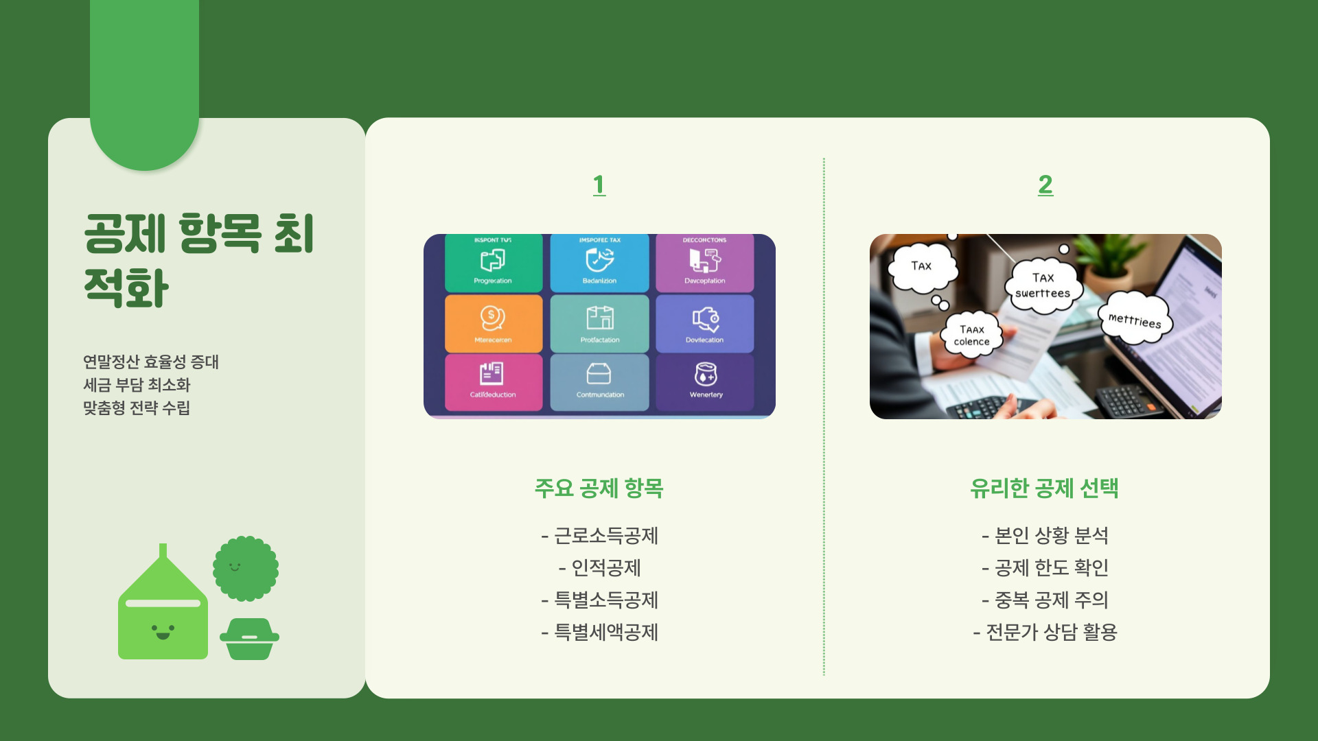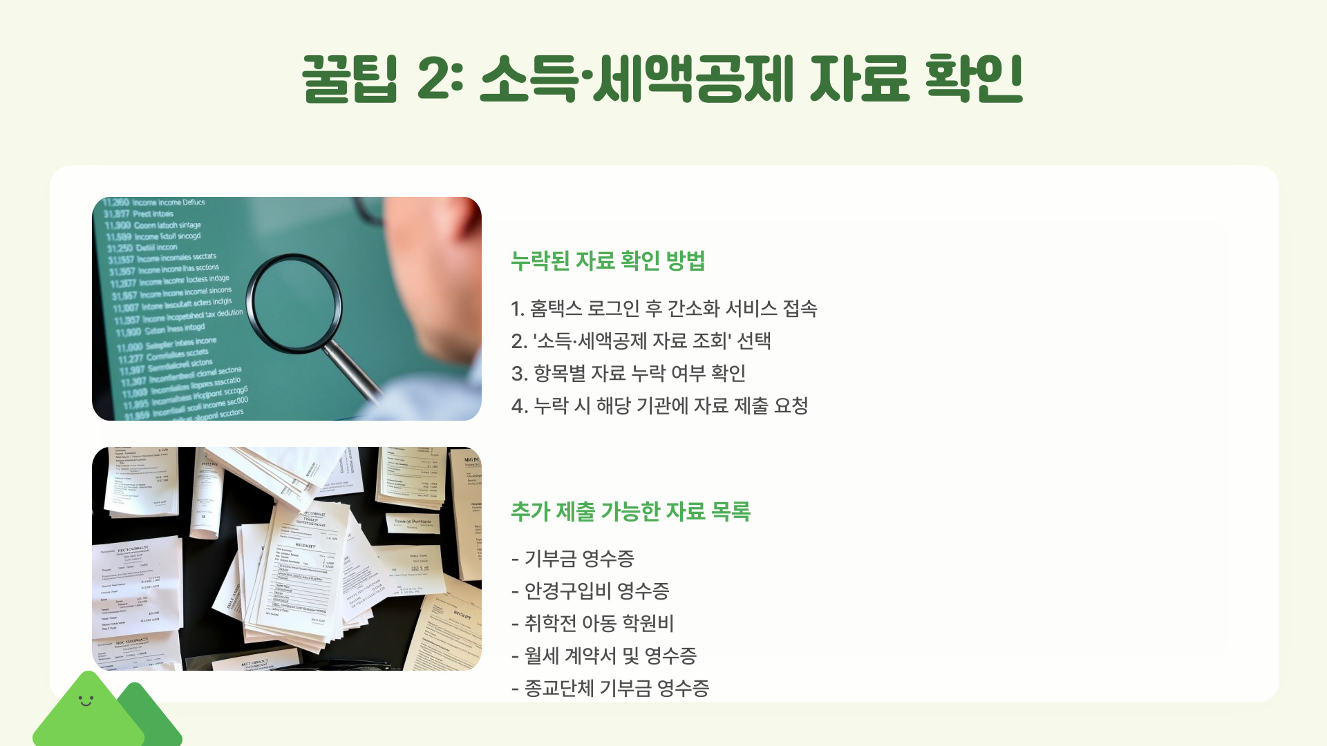 | 공제 항목 체크리스트 만들기 | 누락 방지 및 서류 준비 용이 |