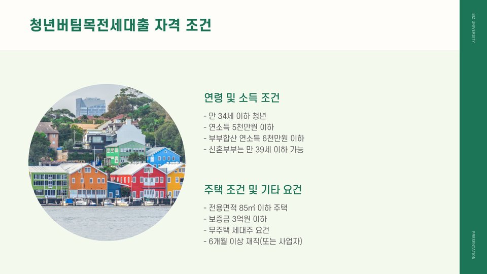 - 청년버팀목전세대출은 청년들의 전세자금 부담을 줄여주는 프로그램입니다.