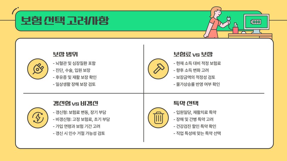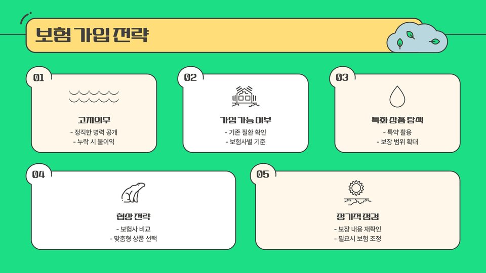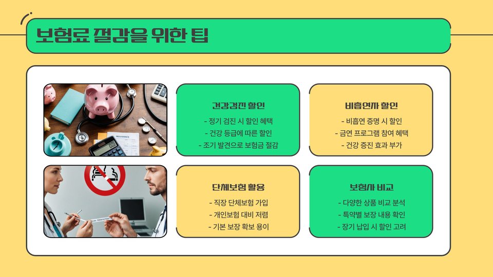 보험 가입 전 충분한 정보 수집과 비교를 통해, 자신의 건강과 재정 상황에 적합한 선택을 할 수 있도록 하세요. 이러한 준비가 당신의 미래를 더욱 안전하게 만들어 줄 것입니다.