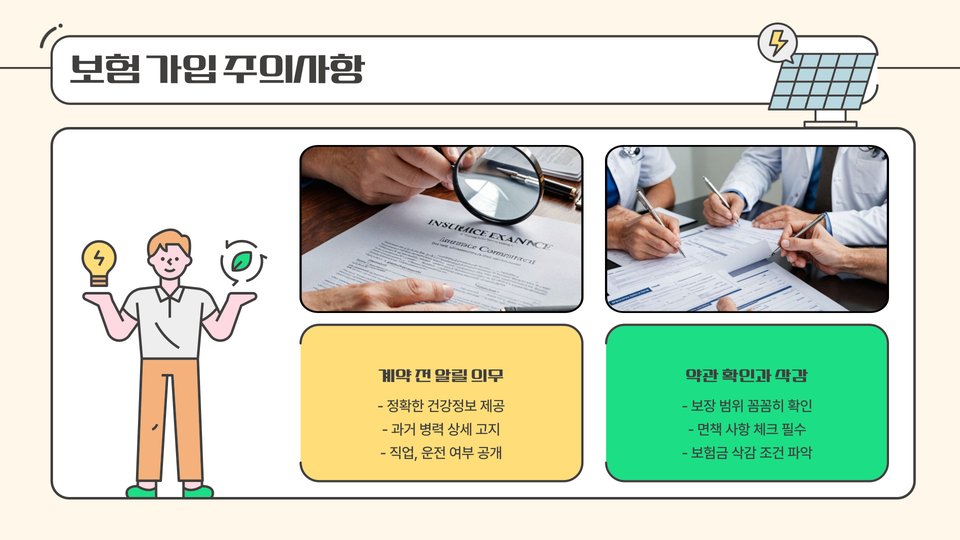 보험 가입 전 충분한 정보 수집과 비교를 통해, 자신의 건강과 재정 상황에 적합한 선택을 할 수 있도록 하세요. 이러한 준비가 당신의 미래를 더욱 안전하게 만들어 줄 것입니다.
